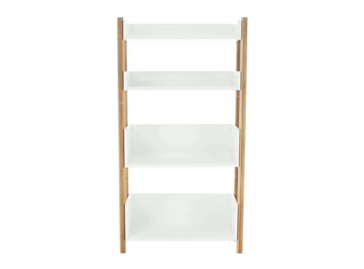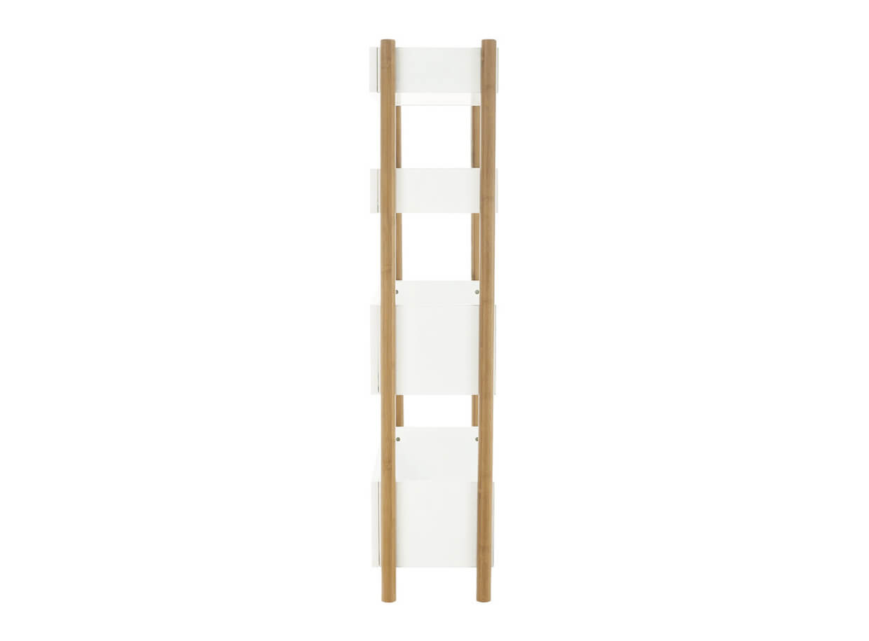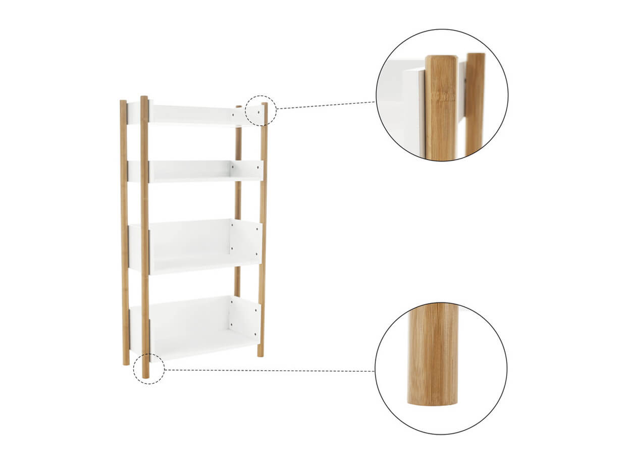 Konstrukce regálu je vyrobena z trvanlivého pevného materiálu, přírodního bambusu, o který jsou připevněny čtyři poličky v bílé barvě.