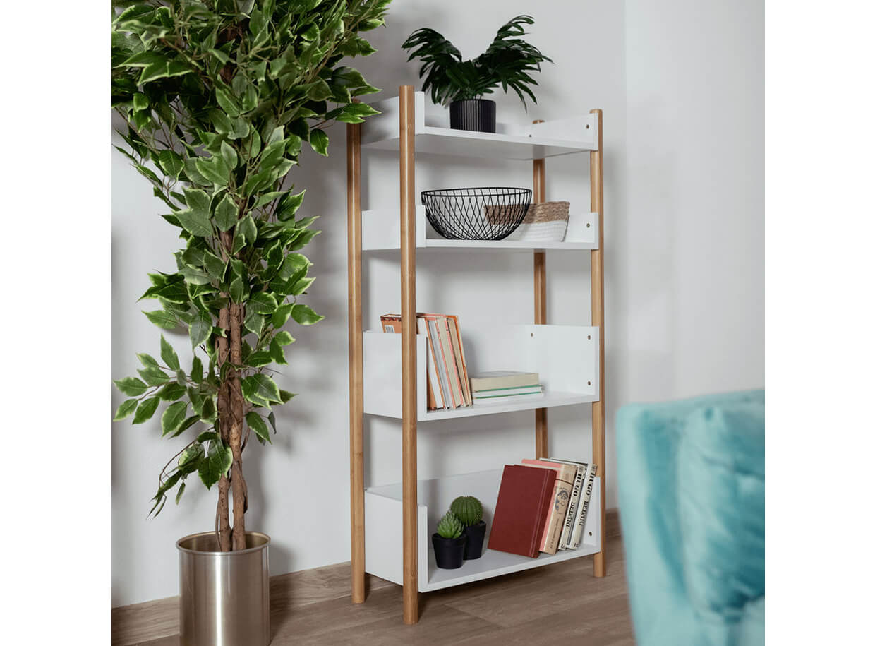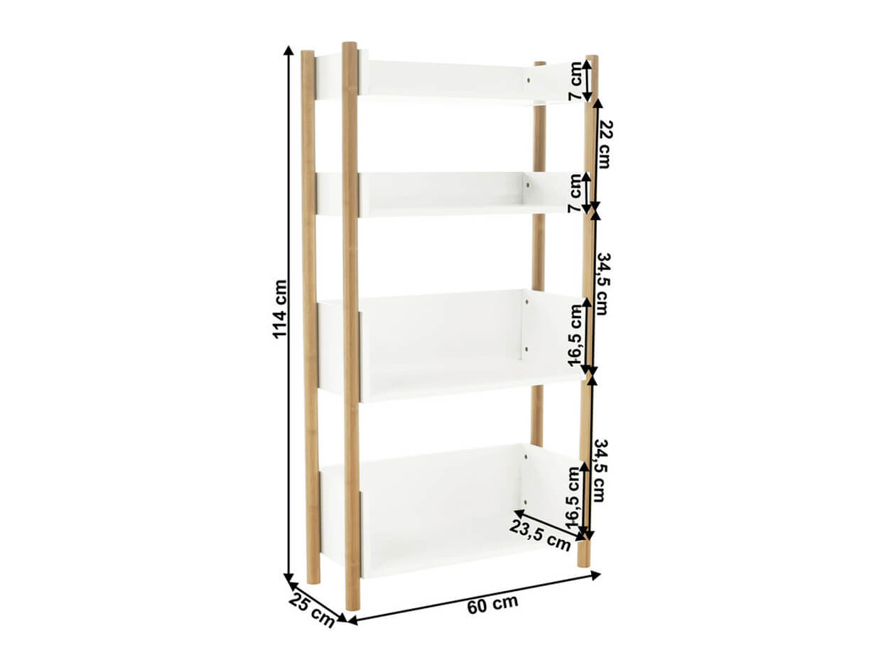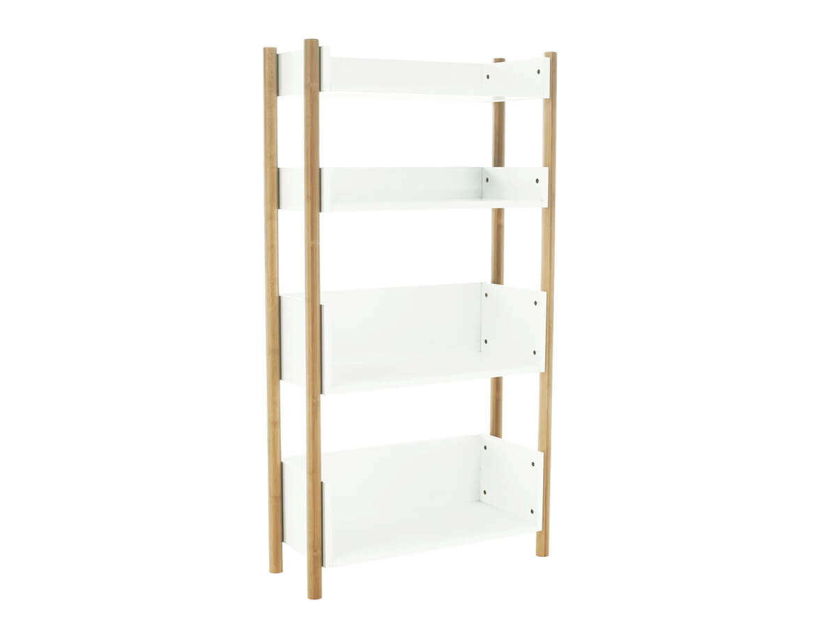 Konstrukce regálu je vyrobena z trvanlivého pevného materiálu, přírodního bambusu, o který jsou připevněny čtyři poličky v bílé barvě.