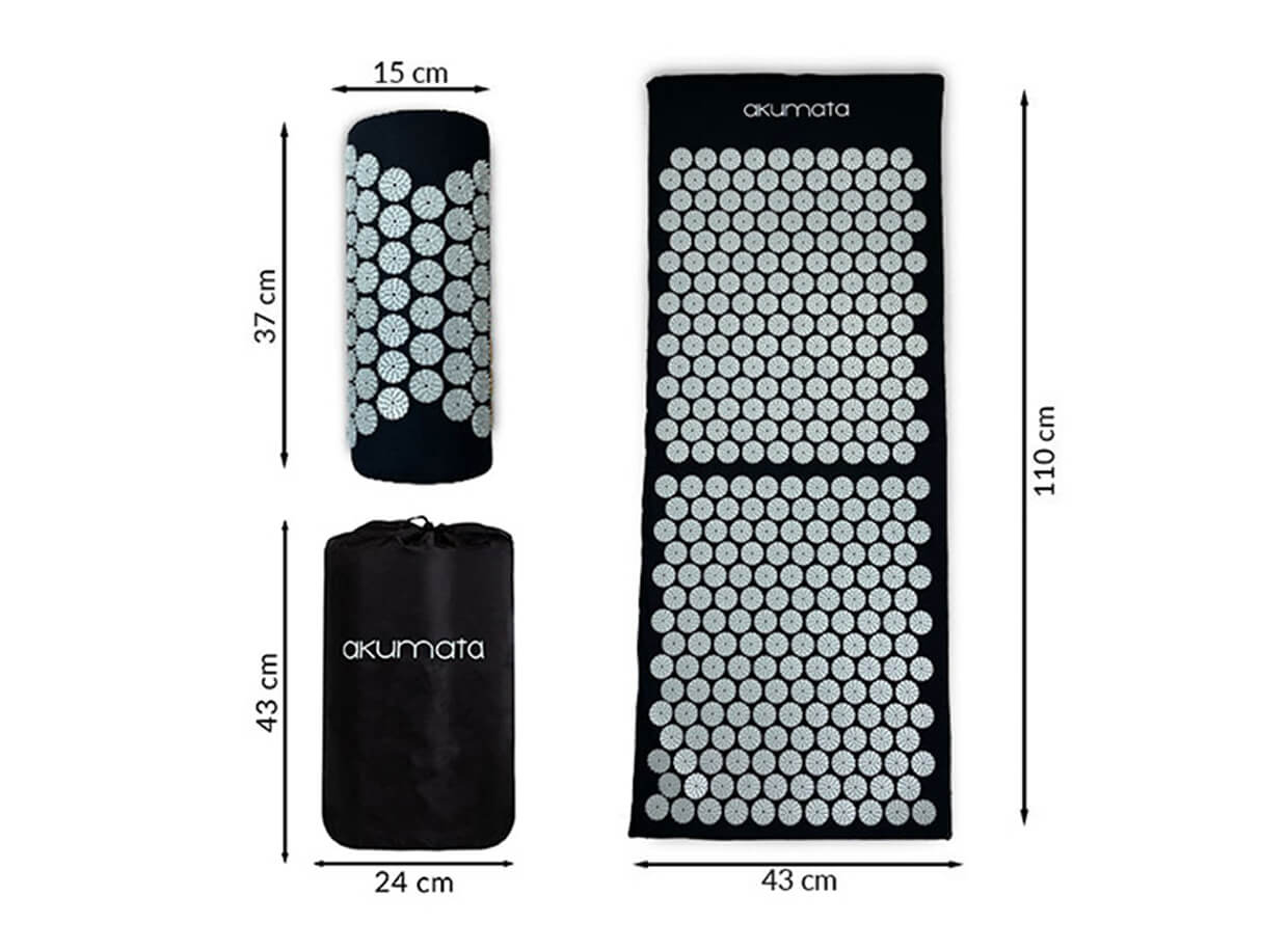 Použití akupresurní sady je jednoduché. Podložku a půlválec můžete používat doma nebo i v práci. Součástí sady je praktický vak, který umožní pohodlný přenos pomůcek.
