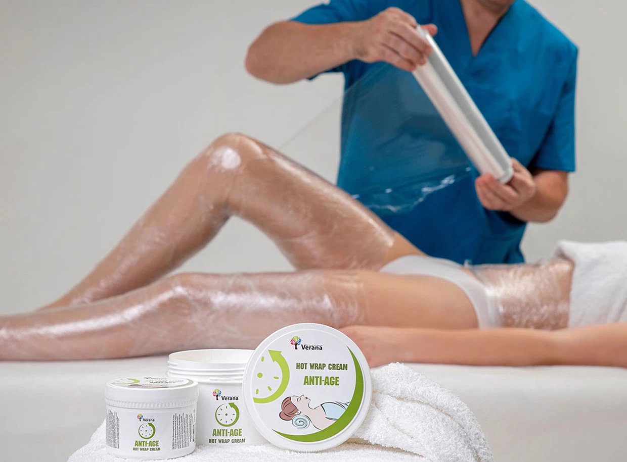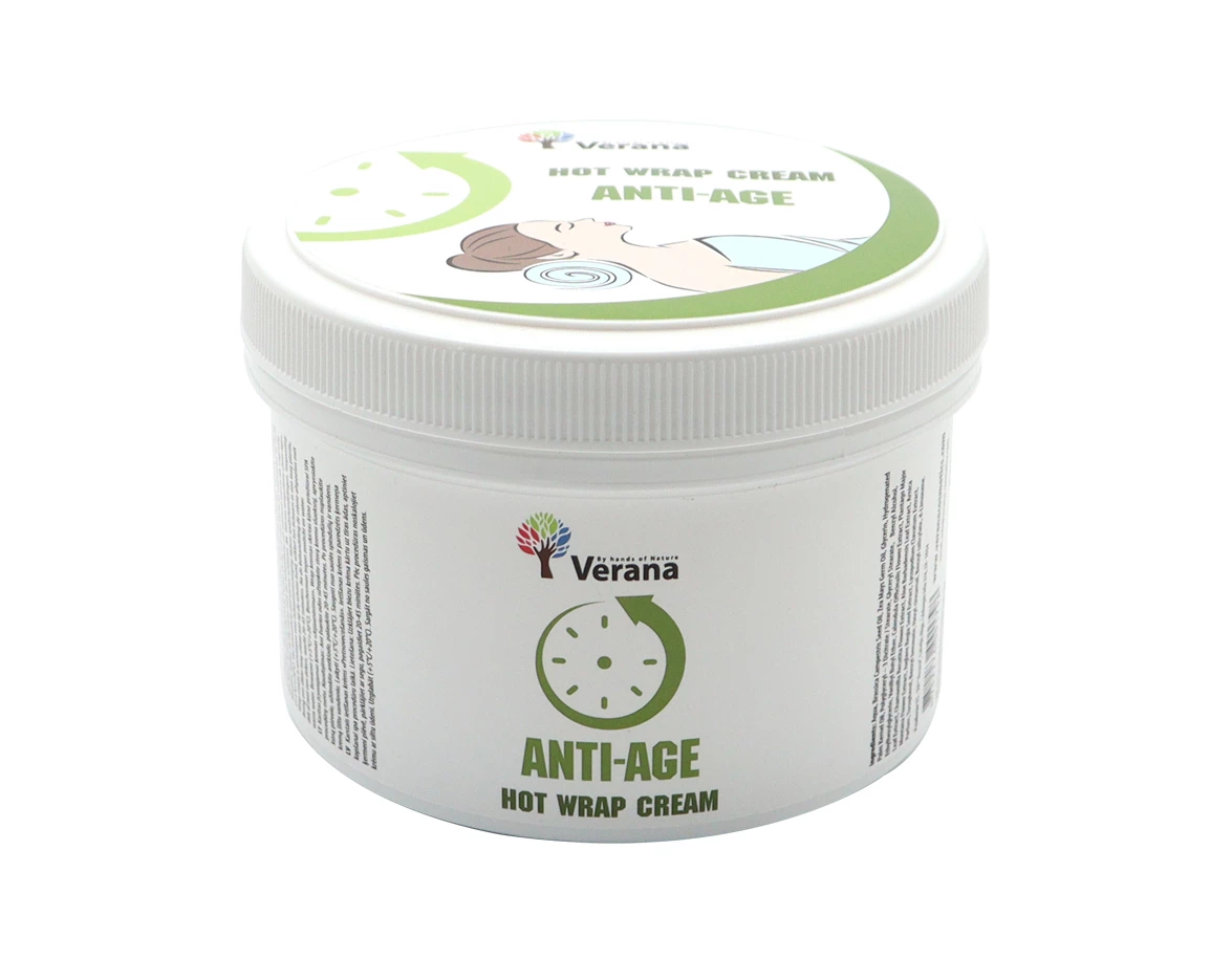 Verana omlazující horký tělový zábal Anti age byl vytvořen pro účinnou péči o tělo během kosmetické procedury Hot Wrap ve SPA salonech i doma. Je vyroben na vodní bázi, díky čemuž dokážou jeho složky proniknout hluboko do všech vrstev pokožky. Krém tak účinně hydratuje a vyživuje pokožku během celé zábalové procedury.