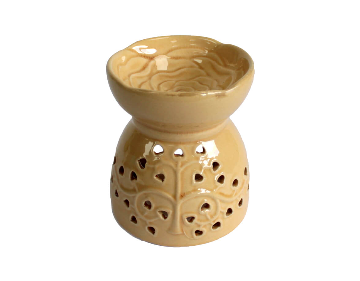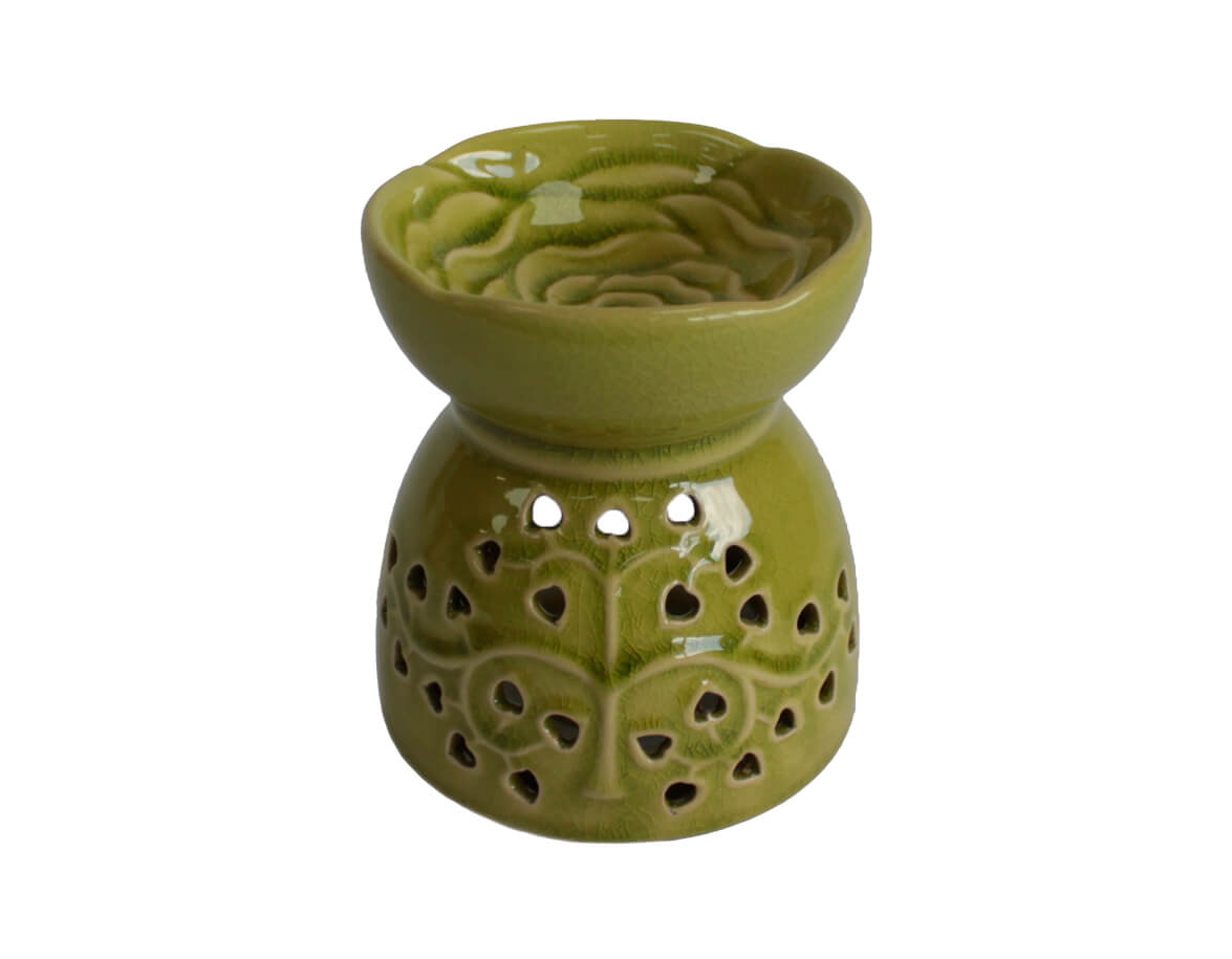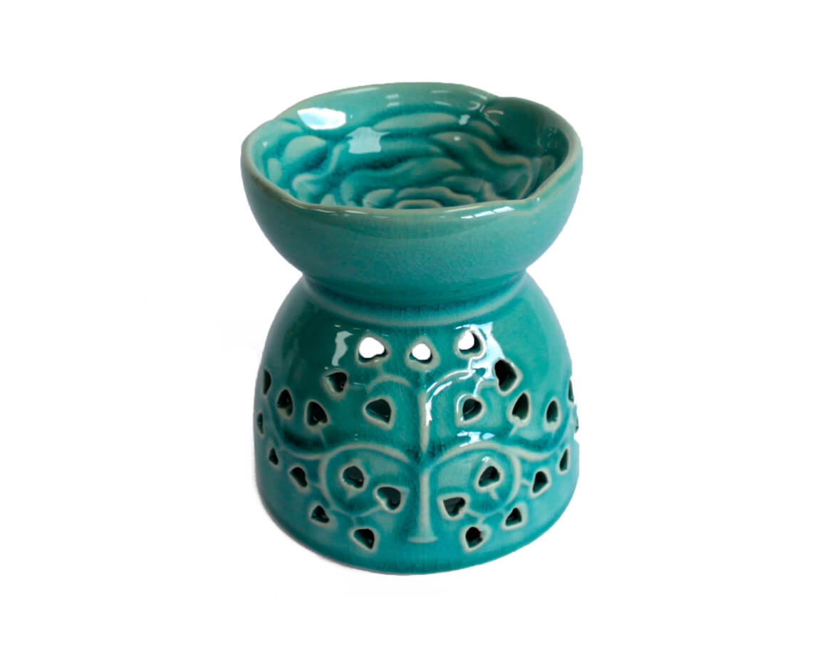 Keramická aromalampa pokrytá modrou glazurou, na základně má jemný reliéfní motiv stromu života a vrchní miska je modelována do tvaru lupenů. Má přitažlivý naturální design a je vhodnou dekorací do interiéru. Dokáže podpořit pohodovou a relaxační atmosféru a provonět prostory masážních salonů, zdravotnických zařízení a a domácností.