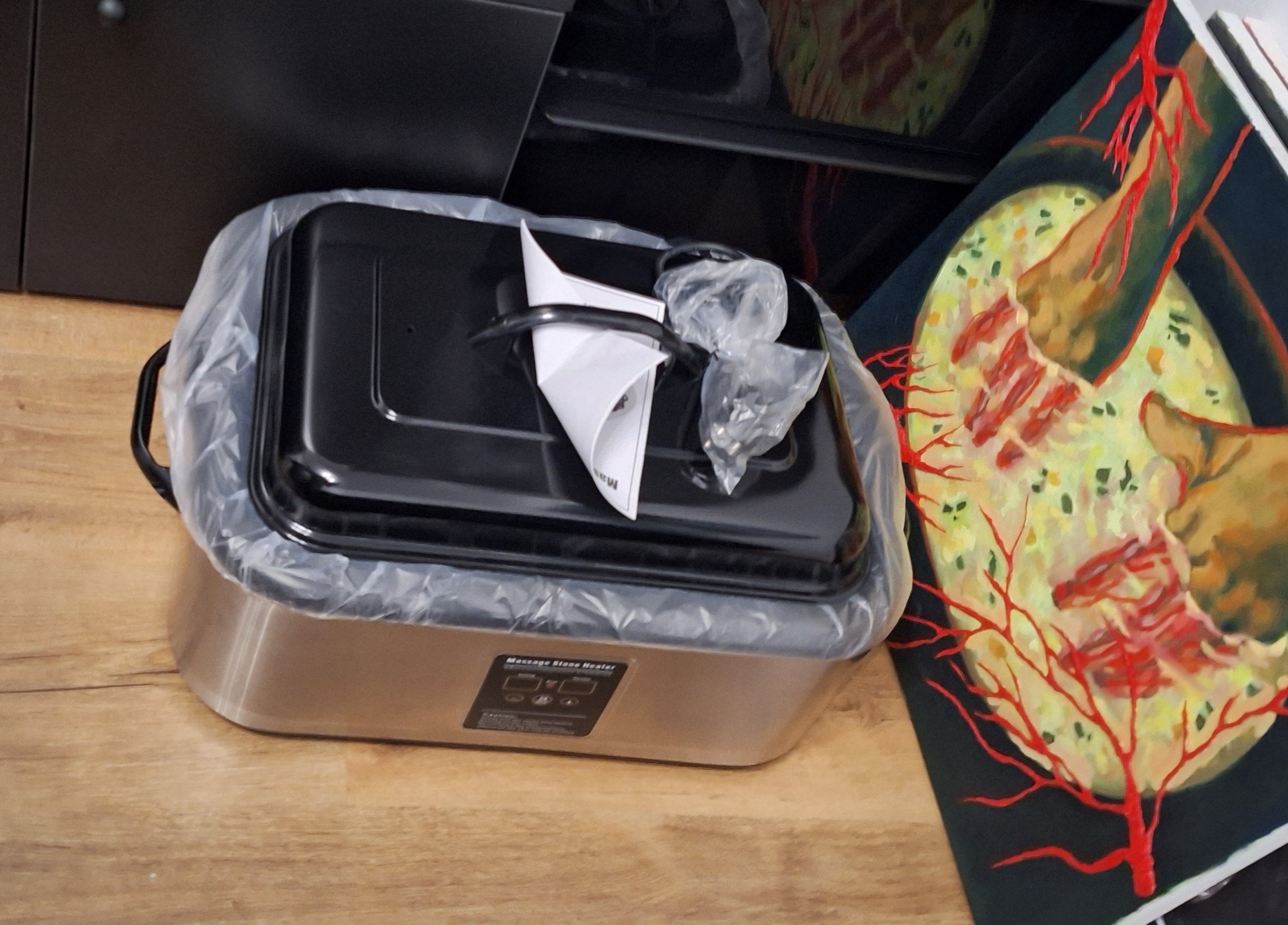 Profesionální ohřívač kamenů s digitálním regulováním teploty. Tělo přístroje je vybaveno napájecím kabelem, digitálním displejem a teplu odolnými rukojeťmi. Vnitřní vyjímatelná nádoba je omyvatelná. Na její dno vkládáme poskládaný bílý ručník, na který rozložíme lávové kameny a doplníme vodu tak, aby byly kameny ponořené, ale nejvíc po rysku s označením max na boku nádoby. Součástí setu je poklice.