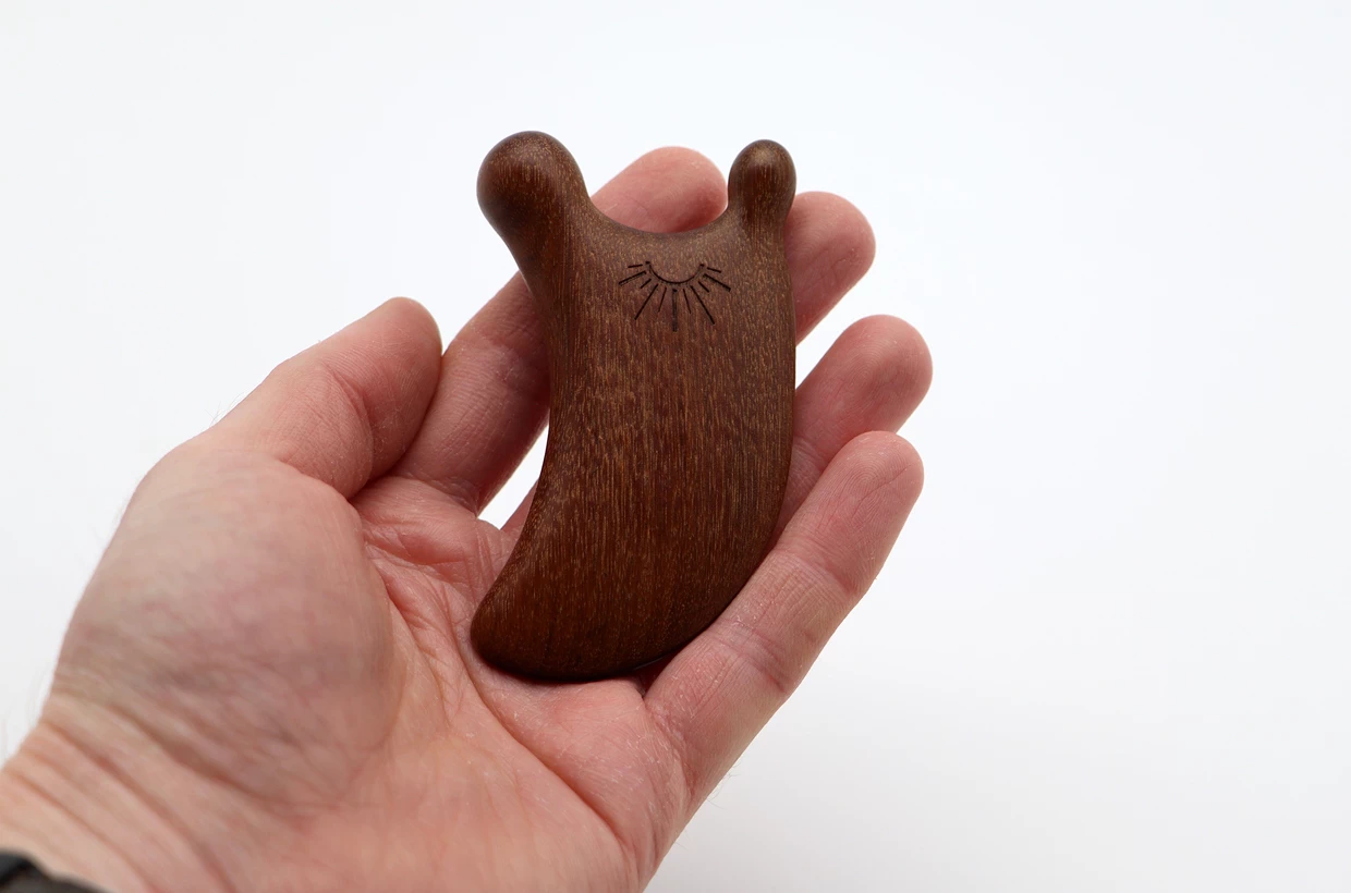 Škrabka ze santalového dřeva určená pro gua sha masáž. Jde o formu tradiční čínské medicíny, která spočívá ve škrábání pokožky tvrdými nástroji, čímž pomáhá uvolnit napjaté svaly, stažené fascie, prokrvit a rozehřát pokožku, rozproudit lymfatický systém, odstranit sraženiny nebo otok a zároveň stimulovat akupresurní body i imunitní systém. Kromě toho gua sha masáž je ideální i při chronické únavě a migréně.