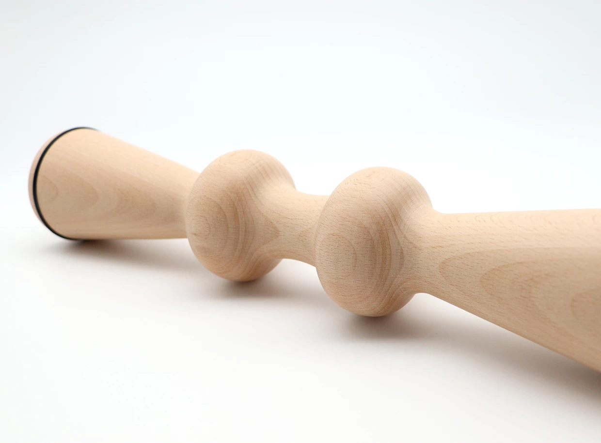 Je vyroben z přírodního, precizně opracovaného dřeva, které nezpůsobuje škrábance na pokožce. Výstupky jsou umístěny tak, aby imitovaly tlak prstů maséra, což umožňuje přesný dosah měkkých tkání podél celé páteře.