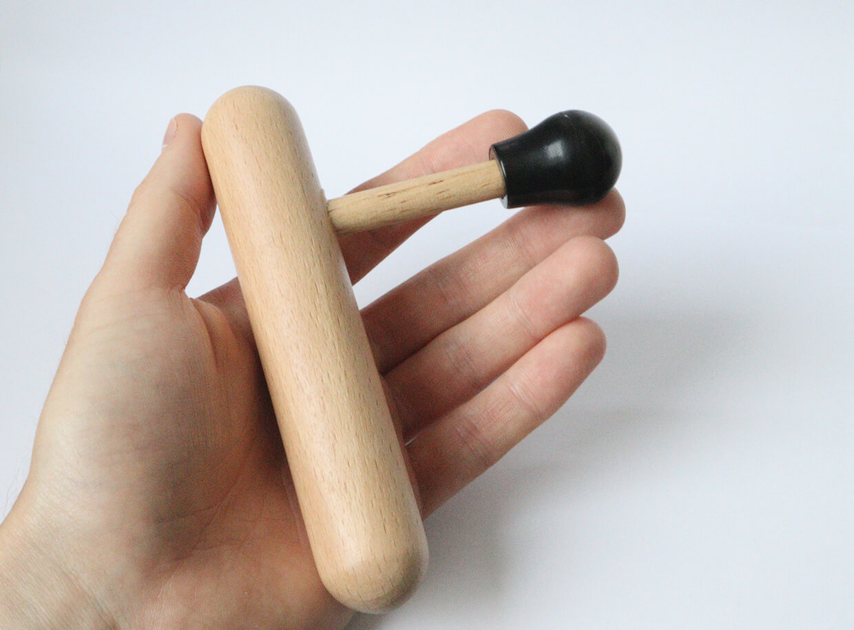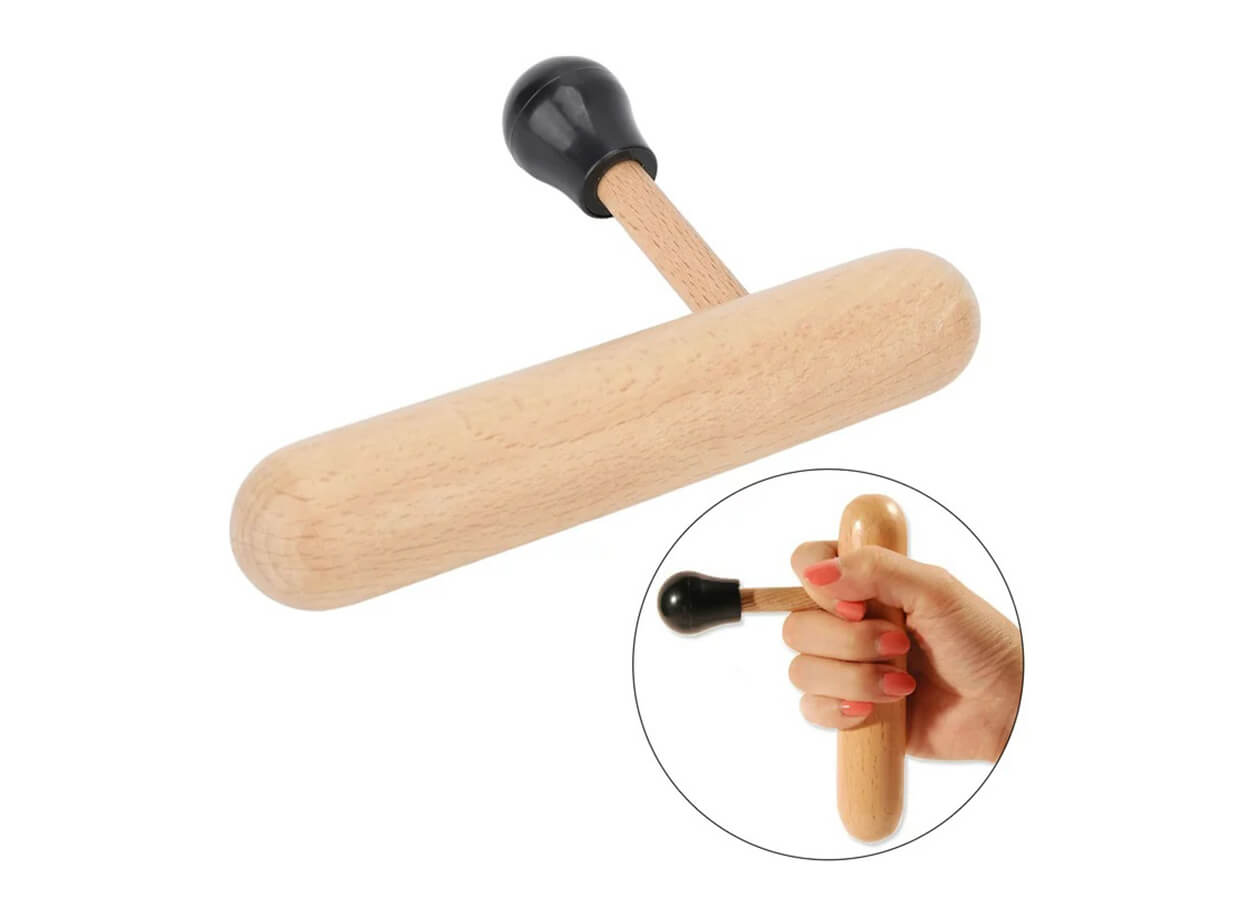 Masážní pomůcka z bukového dřeva s plastovou špičkou určená k ošetření spoušťových bodů a bodovou hloubkovou masáž, která šetří palec maséra a pomáhá předejít únavovým zraněním.