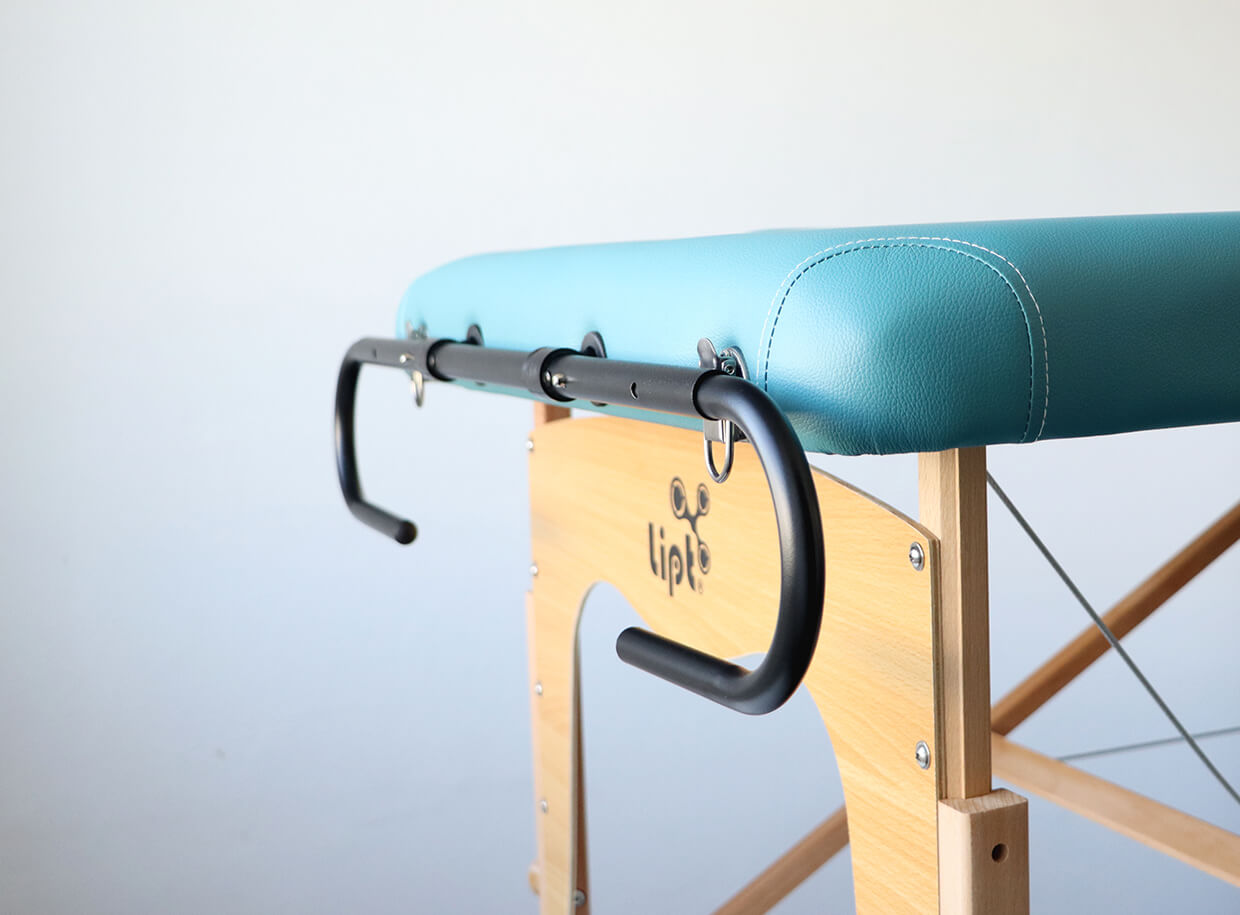 Výstupky držáku se jednoduše nasazují do otvorů na konci masážního stolu. Mají na sobě pojistky, které uvnitř zacvaknou a zajistí pevné umístění držáku na lehátku.
