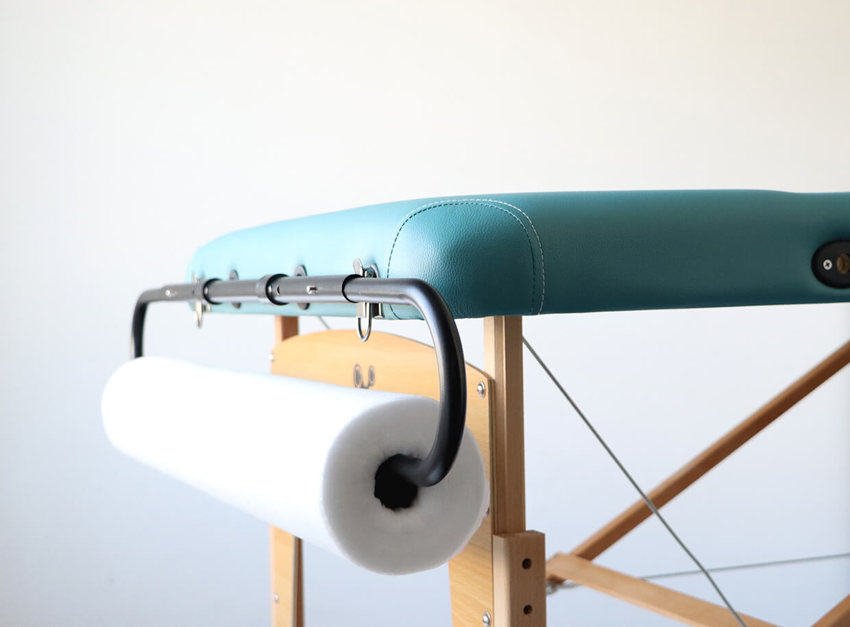 Kovový držák pro jednorázové prostěradla v roli. Dá se připevnit o masážní lehátko, díky čemuž má masér plachtu ihned k dispozici a usnadňuje její natažení na lehátko. Doplňkem k držáku je elastická gumička, která se umísťuje z druhé strany stolu. Pomocí ní prostěradlo na stole drží napnuté a nesroluje se.