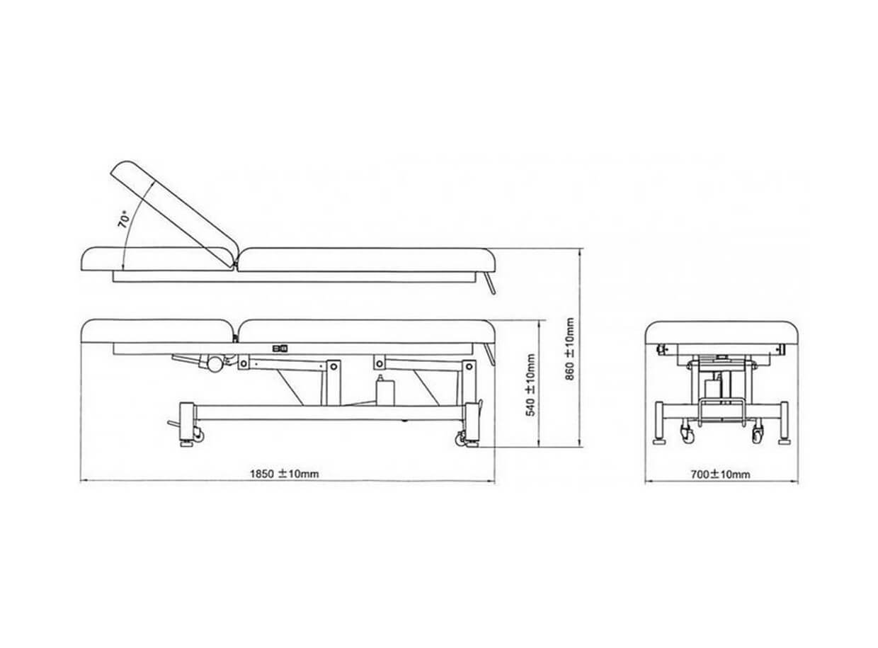 Na boční straně lehátka jsou dvě tlačítka pro ovládání 2 motorů, kterými se přizpůsobuje výška lehátka a sklon zádové opěrky. Nastavitelná výška stolu se pohybuje od 54 po 86 cm, stůl má klasickou šířku 70 cm, optimální pro většinu masérů a masážních procedur, ale pohodlnou i pro klientky kosmetického salonu. Ve vodorovné poloze má stůl délku 185 cm.