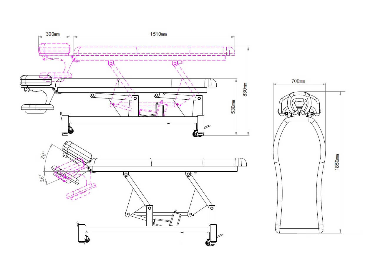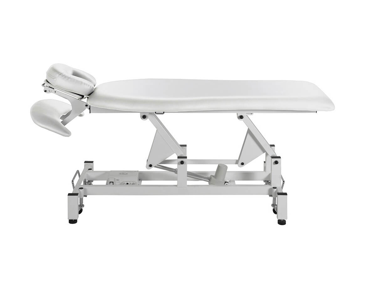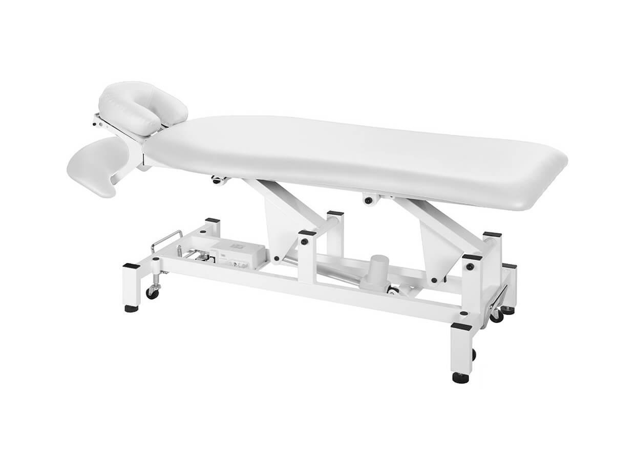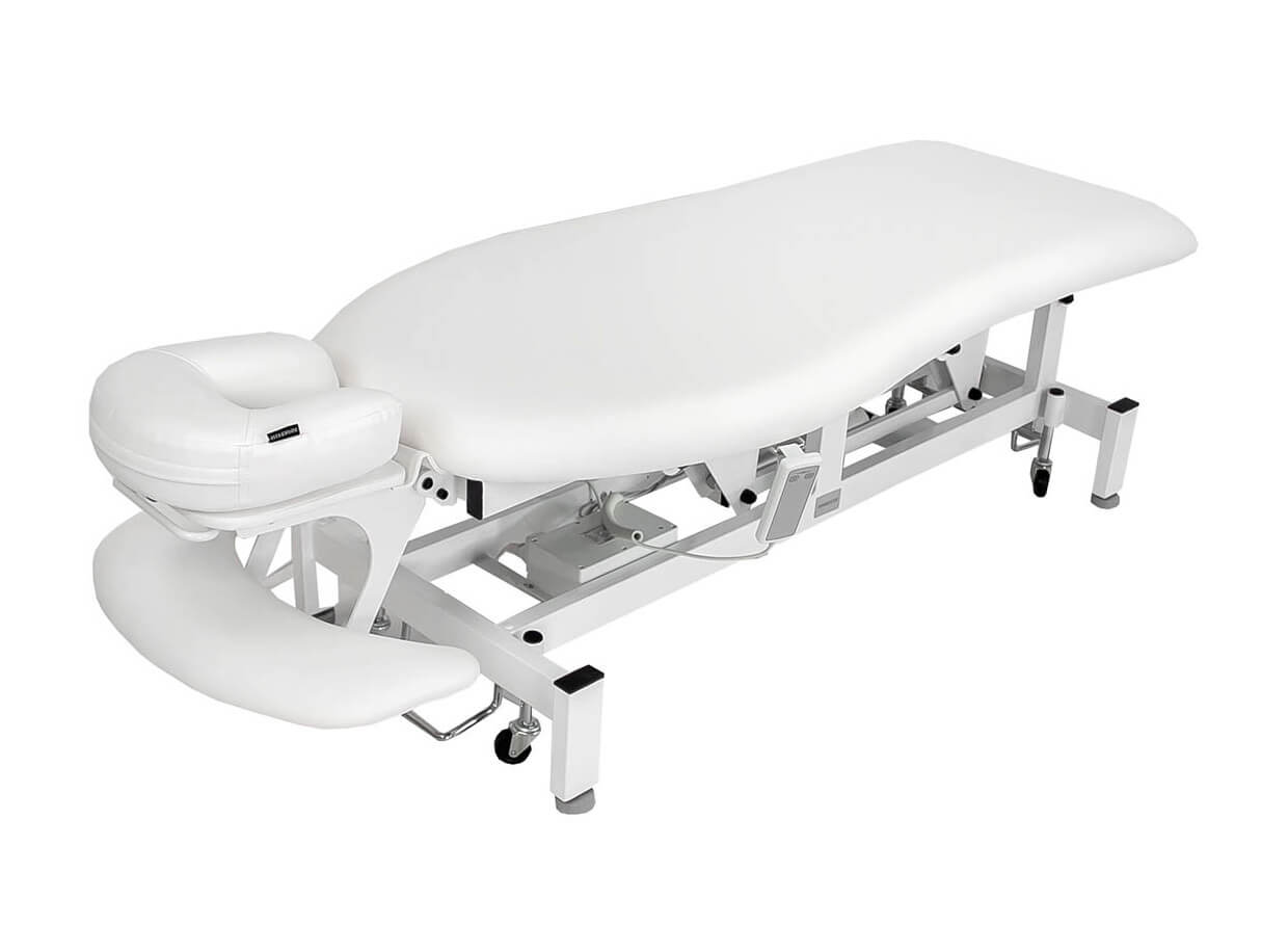 Jednodílné tvarované masérské lehátko s podhlavníkem vybavené motorem pro ovládání výšky od 53 do 83 cm s ručním ovladačem.