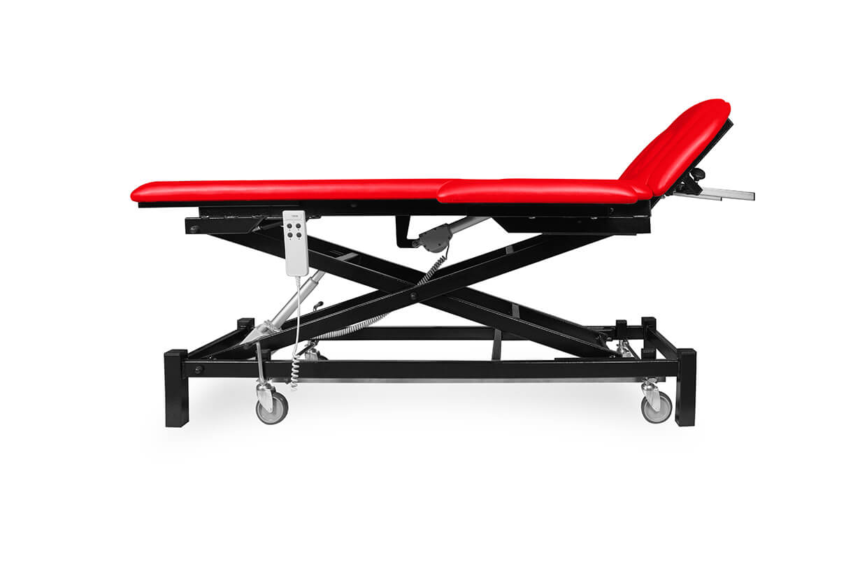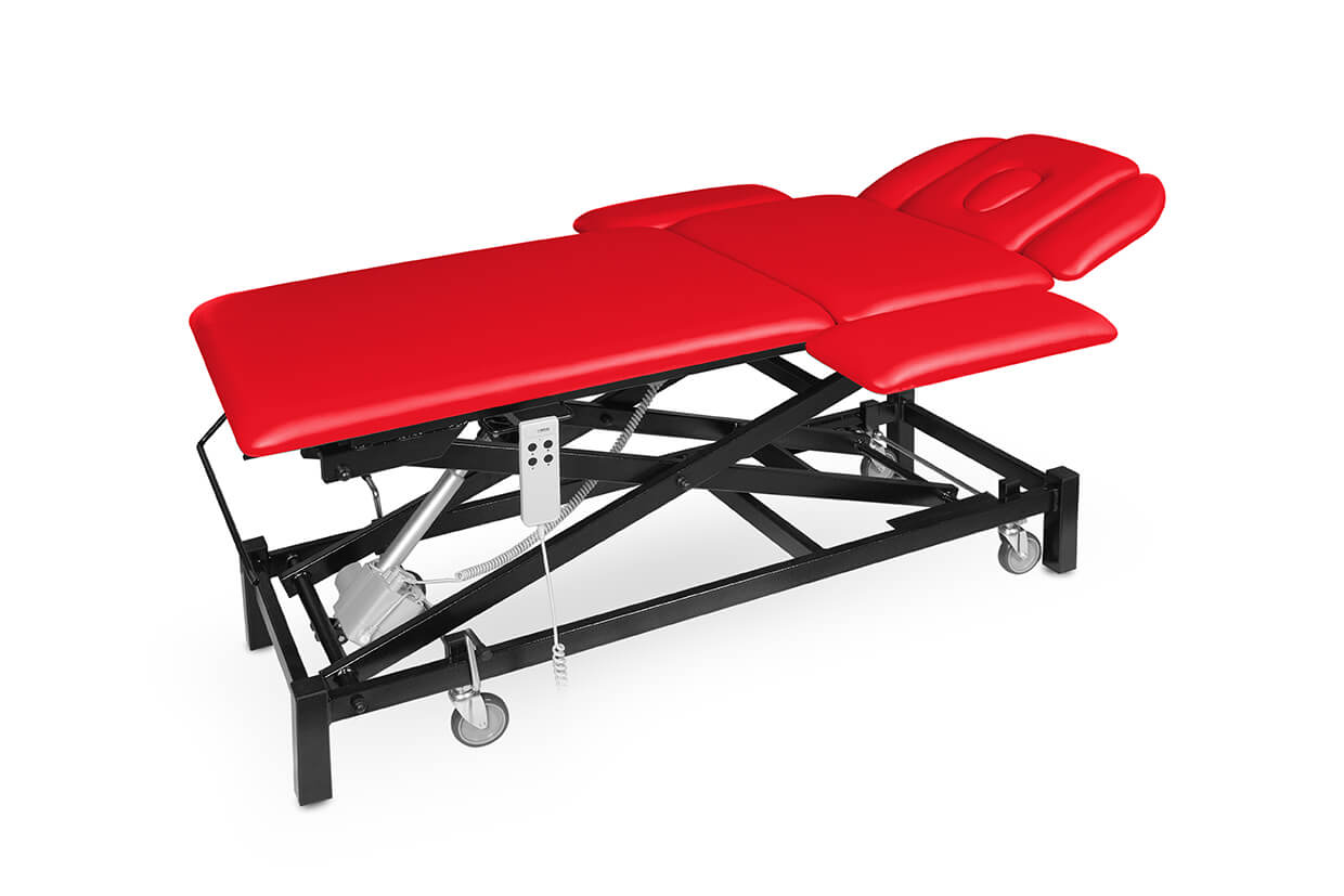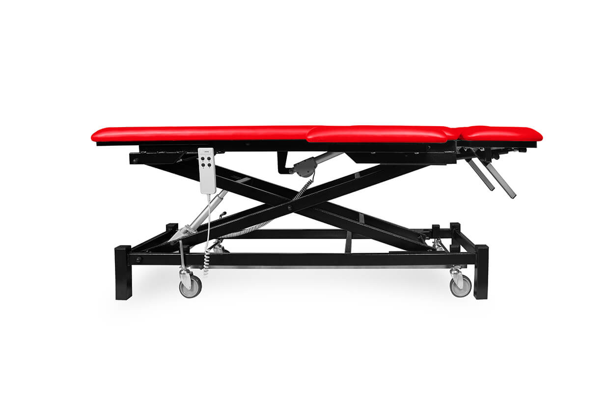 Profesionální trojdílné elektricky polohovatelné lehátko se spolehlivým a tichým motorem, s nůžkovým mechanizmem zdvihu, který zaručuje pohyb lehátka nahoru a dolu bez posunu do stran a extra vysokým zdvihem až 100 cm. Lehátko je pohodlně čalouněné 4 cm hrubým molitanem a kvalitní, lehce čistitelnou koženkou a vybavené nastavitelnými protiskluzovými nožičkami. Vrchní a spodní (V zdvih) díl lehátka se dají polohovat pomocí plynové vzpěry. V ceně lehátka je ruční ovladač.