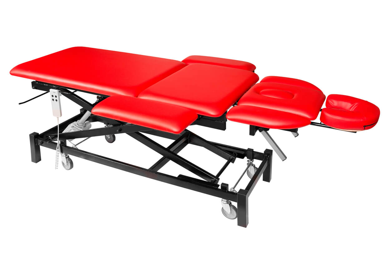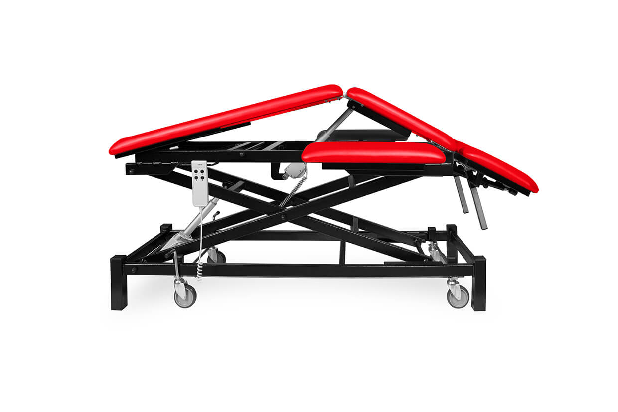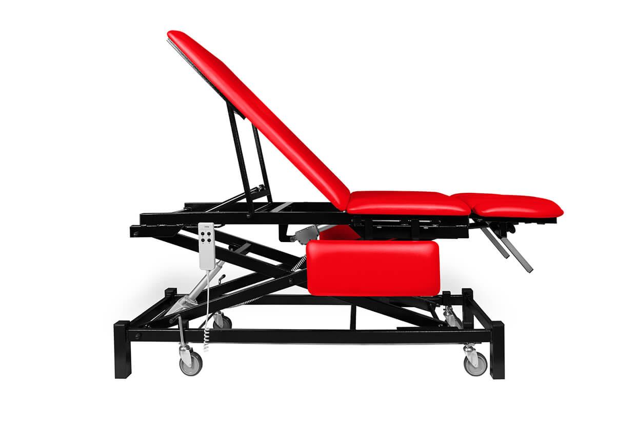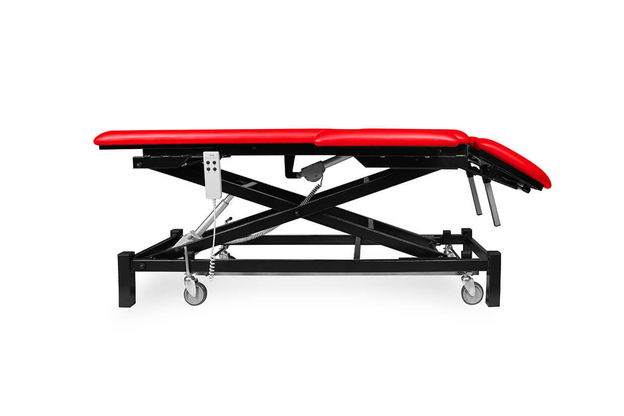 Profesionální trojdílné elektricky polohovatelné lehátko se spolehlivým a tichým motorem, s nůžkovým mechanizmem zdvihu, který zaručuje pohyb lehátka nahoru a dolu bez posunu do stran a extra vysokým zdvihem až 100 cm. Lehátko je pohodlně čalouněné 4 cm hrubým molitanem a kvalitní, lehce čistitelnou koženkou a vybavené nastavitelnými protiskluzovými nožičkami. Vrchní a spodní (V zdvih) díl lehátka se dají polohovat pomocí plynové vzpěry. V ceně lehátka je ruční ovladač.