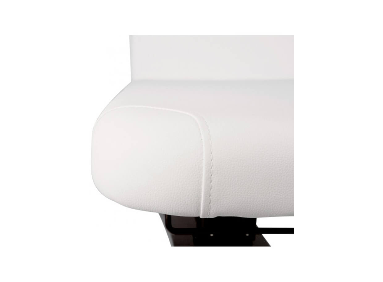 Lehátko je komfortní, čalouněné PU kůží, která je odolná, příjemná na dotek a snadno se udržuje v hygienické čistotě. Zádová část lehátka má otvor na obličej krytý zátkou, takže tento elektrický stůl je vhodný také pro masáž nebo kosmetiku. Pod nožní částí je schovaný držák na plachtu nebo ručník v barvě konstrukce.