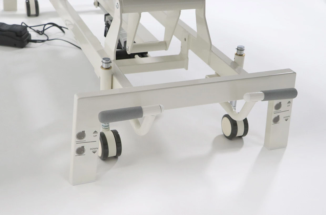 Pro ovládání pohybu lehátka směrem nahoru a dolů slouží praktický přepínací nožní ovladač. Spodní rám lehátka je vybaven 4 kolečky pro snadné přesouvání, které sklopíte nebo zvednete jedním pohybem.