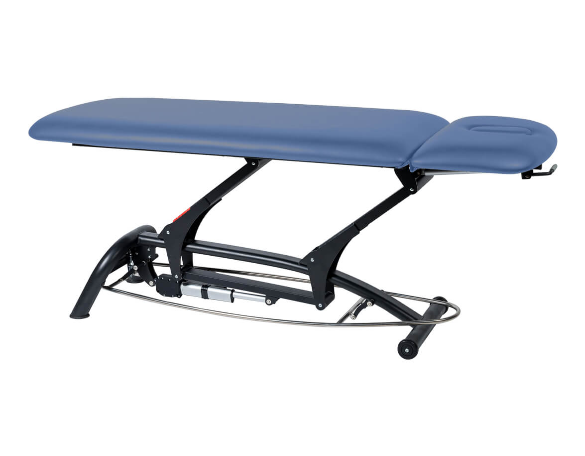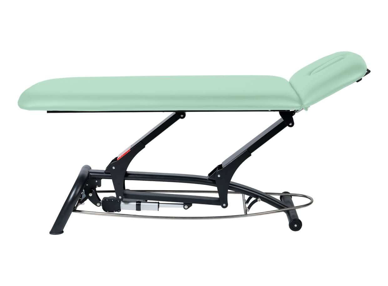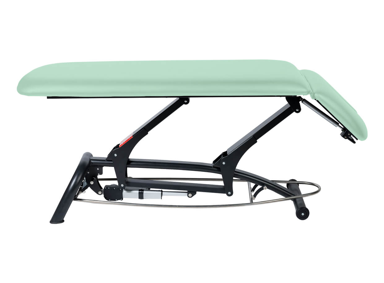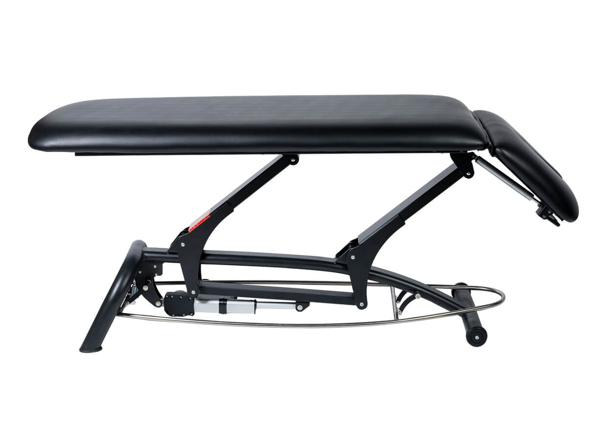 Dvoudílné elektrické lehátko s polohovatelným podhlavníkem vhodné pro masáž, fyzioterapii nebo jako vyšetřovací lehátko.