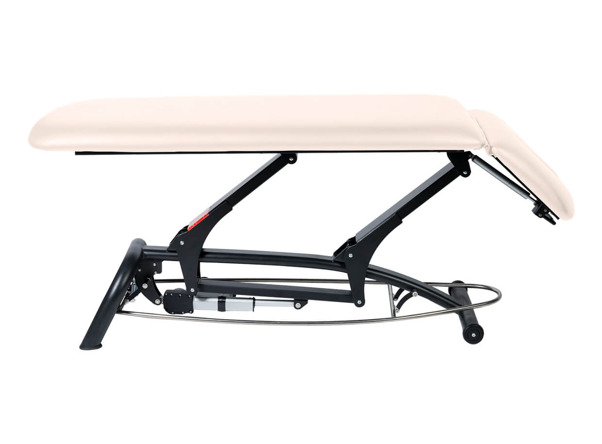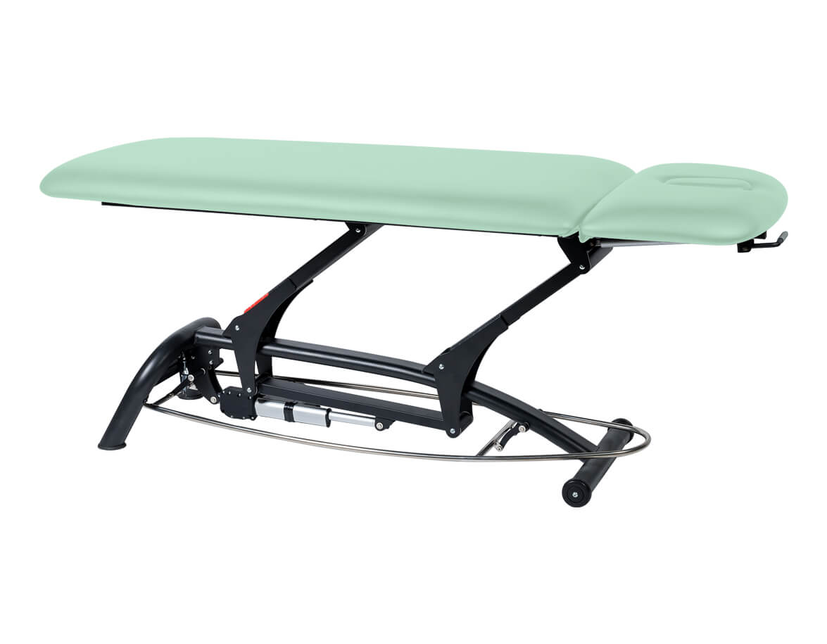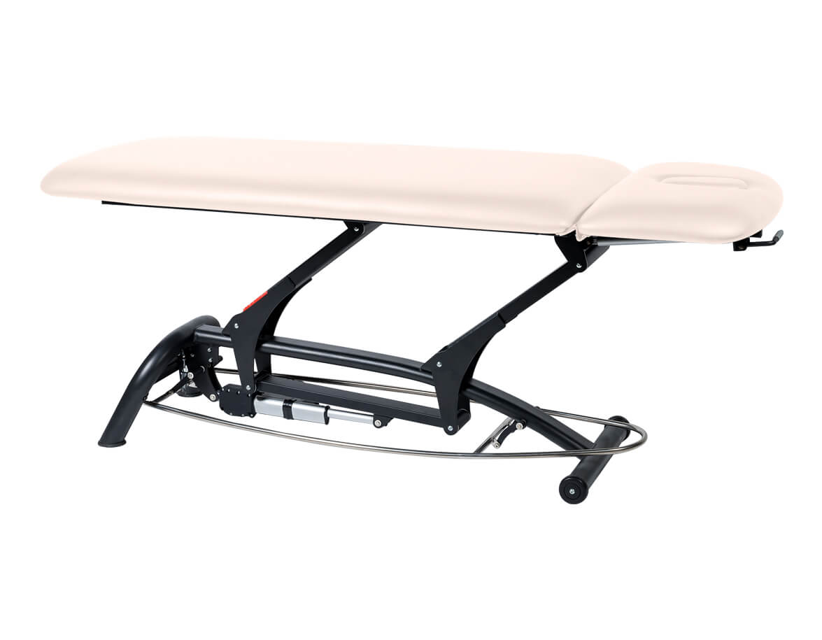 Pokud rámový ovladač v kterémkoli místě přistoupíte, lehátko se posouvá směrem nahoru. Posun lehátka směrem dolů zabezpečíte zvednutím rámového ovladače chodidlem. Rozsah výšky od 44 po 94 cm je dostatečný pro pohodlnou práci maséra i pro bezpečné nasedání a sesedání klientů z lehátka.