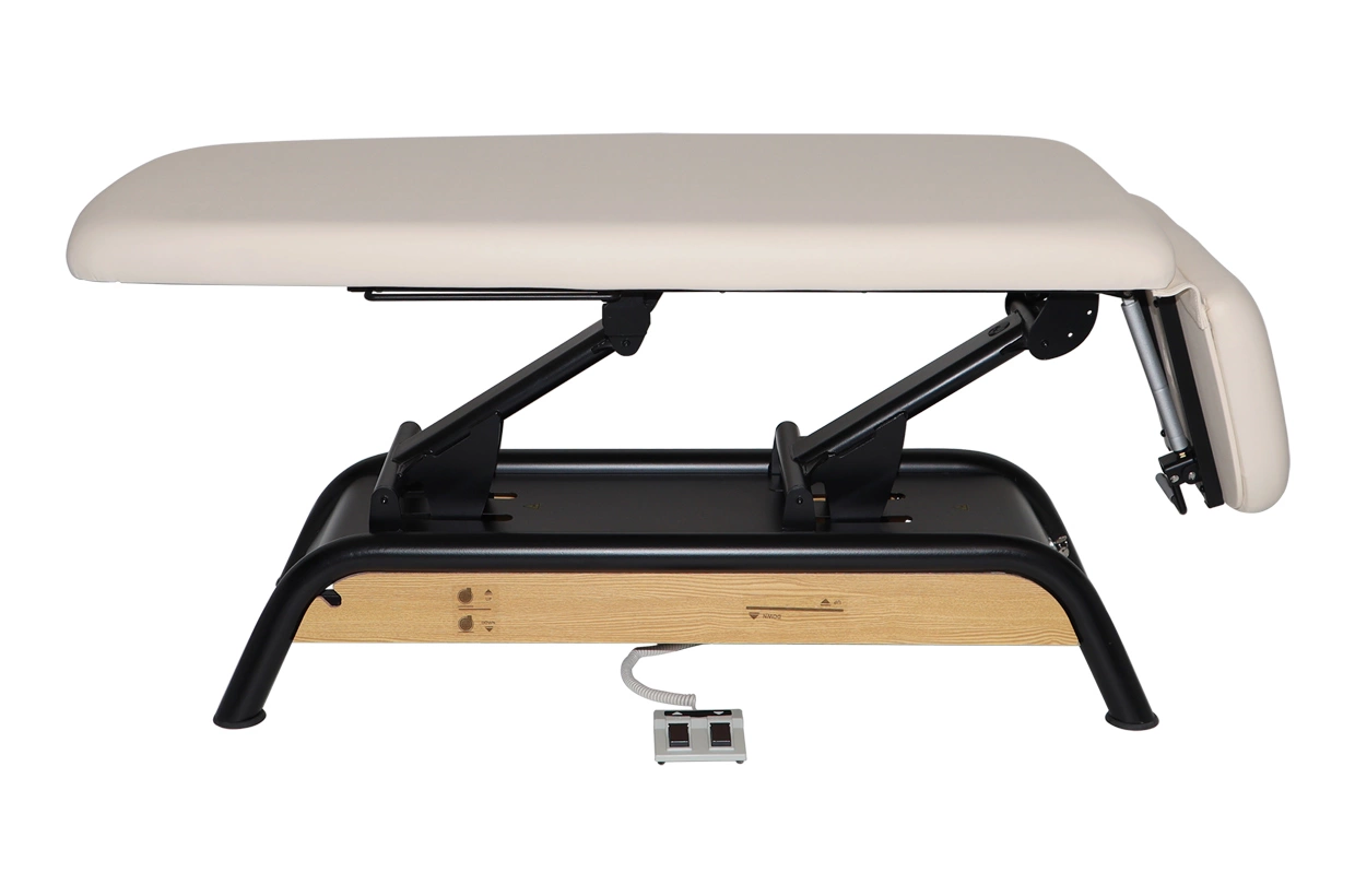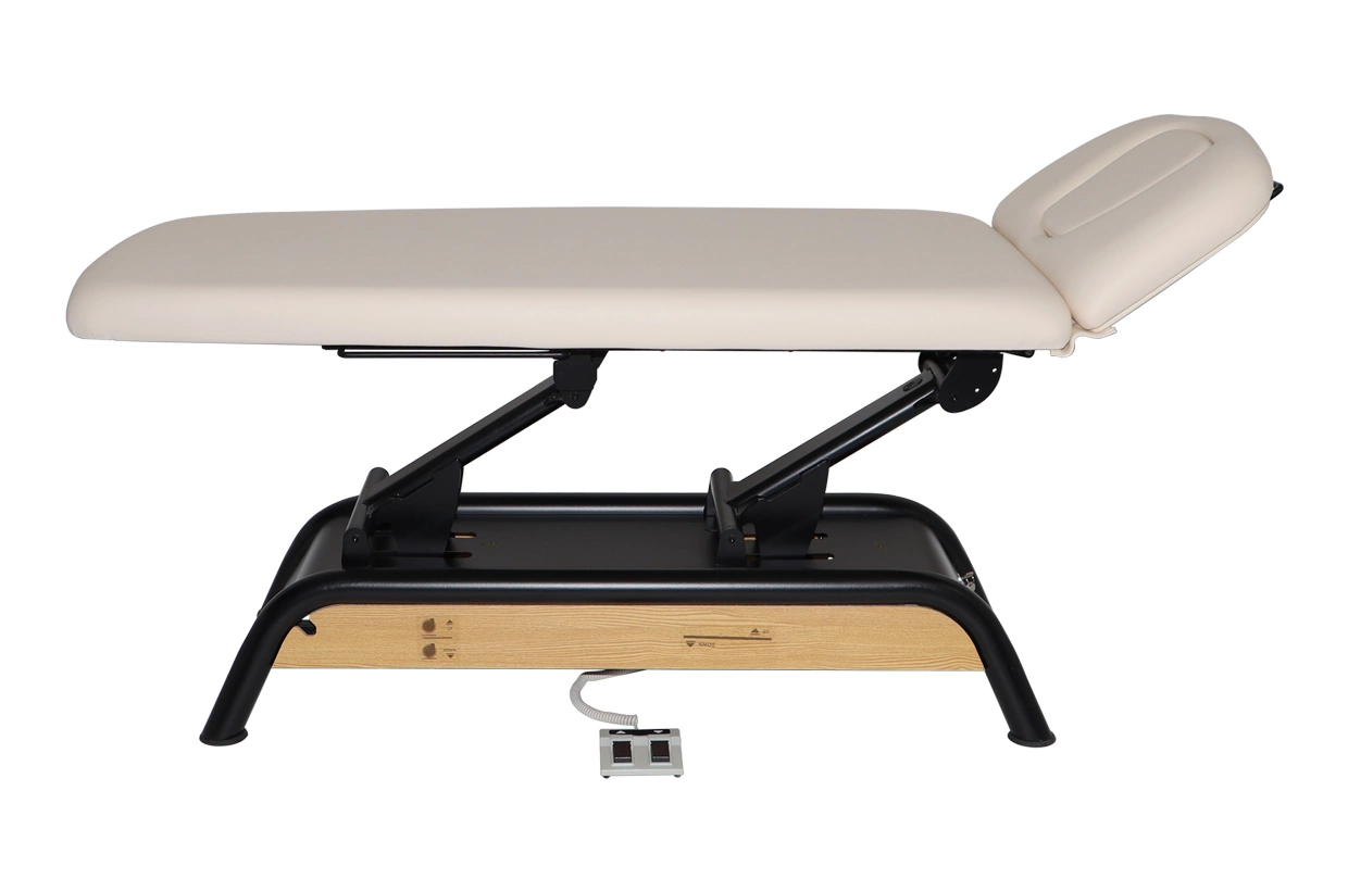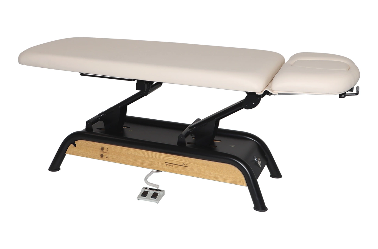 Elektromotor lehátka je velmi tichý, neruší průběh procedury. Nosnost 200 kg je dostačující také pro vyšší váhové kategorie klientů nebo procedury, kde potřebuje masér vyvinout více síly. Spolehlivý elektromotor je umístěn ve spodní části konstrukce a kryt lištami s příjemným designem dřeva. Na konstrukci v přední části se nachází bezpečnostní zámek, v případě uzamčení nelze měnit výškové nastavení lehátka.