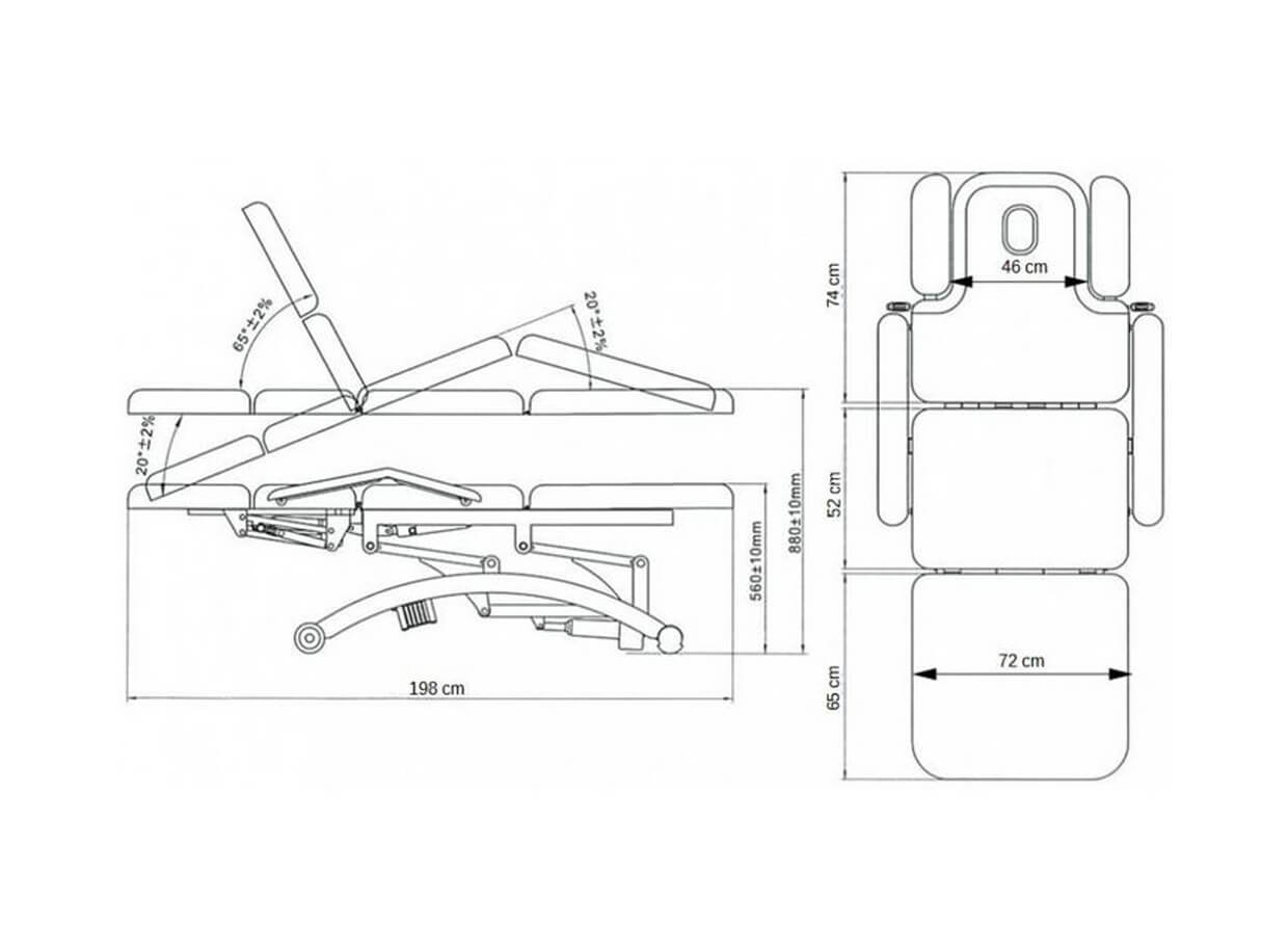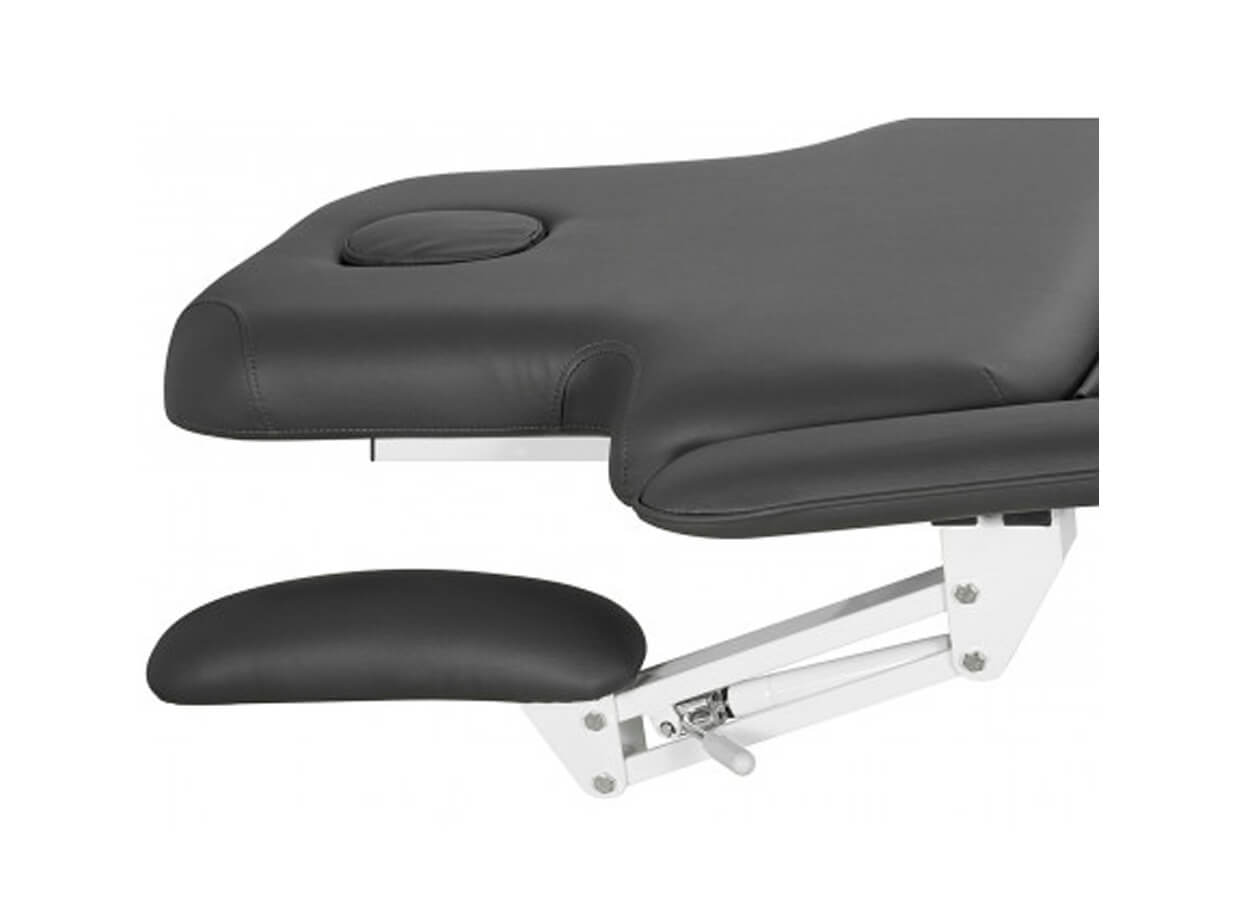 Sedací část je vybavena dvěma typy opěrek pod ruce. Odnímatelné opěrky rukou o šířce 11 cm na bocích přizpůsobují svůj úhel nastavení lehátka. Opěrky loktů u hlavové části o šířce 12 cm využijete při poloze klienta na břiše. Ovládají se pneumatickou páčkou.
