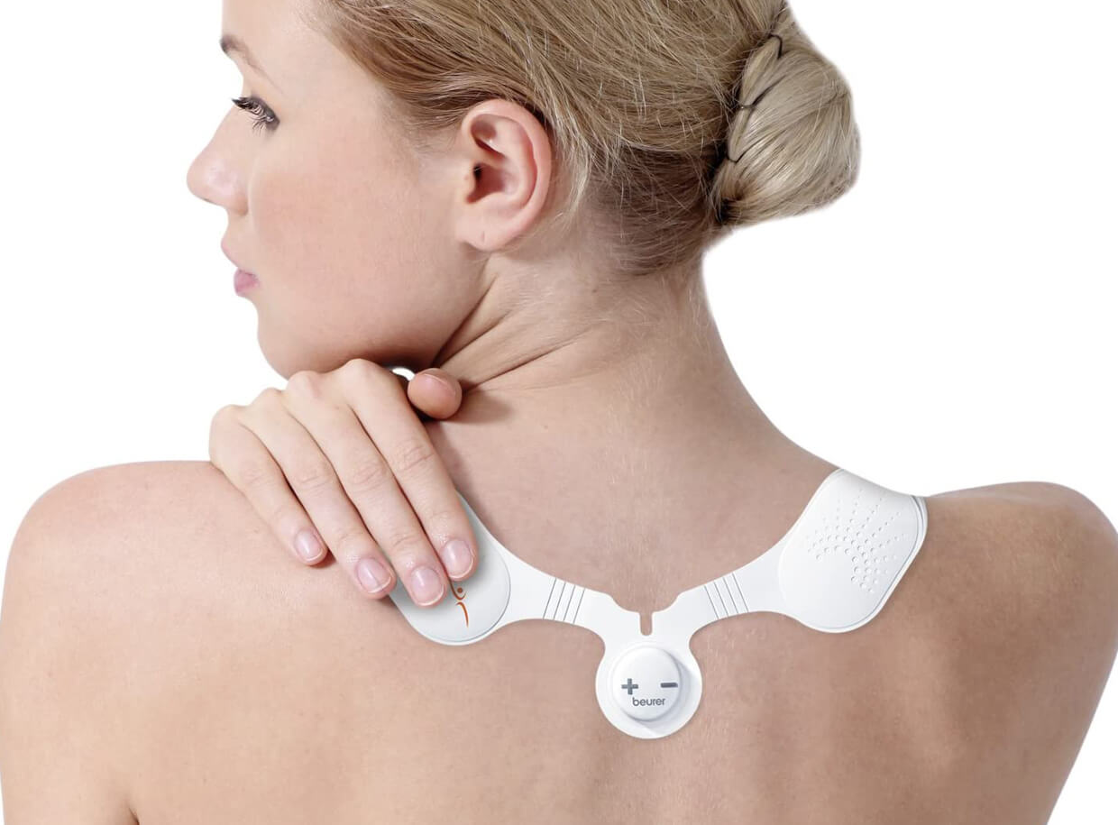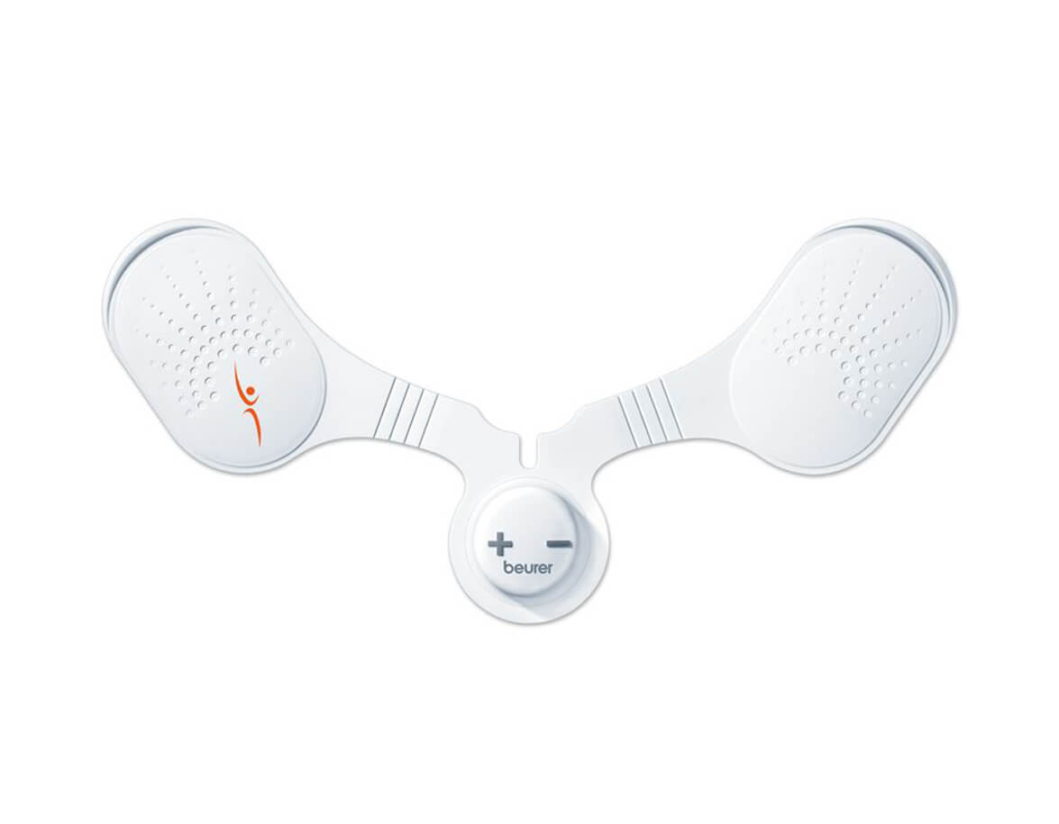 Elektrostimulátor BEURER EM 20 pro posílení a regeneraci svalů v oblasti krku, ramen a zad. Přístroj je vyroben z tenkého silikonu, má ergonomický tvar a díky samolepícím gelovým náplastím pevně drží na pokožce.