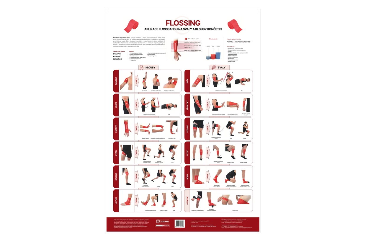 Plakát Flossing prostřednictvím fotografií vyobrazuje konkrétní způsoby aplikace kompresní gumy na svaly a klouby končetin, které jsou doplněny o jednoduché cviky. Aplikace a cviky jsou rozděleny podle jednotlivých partií, díky čemuž je plakát přehlednou pomůckou.