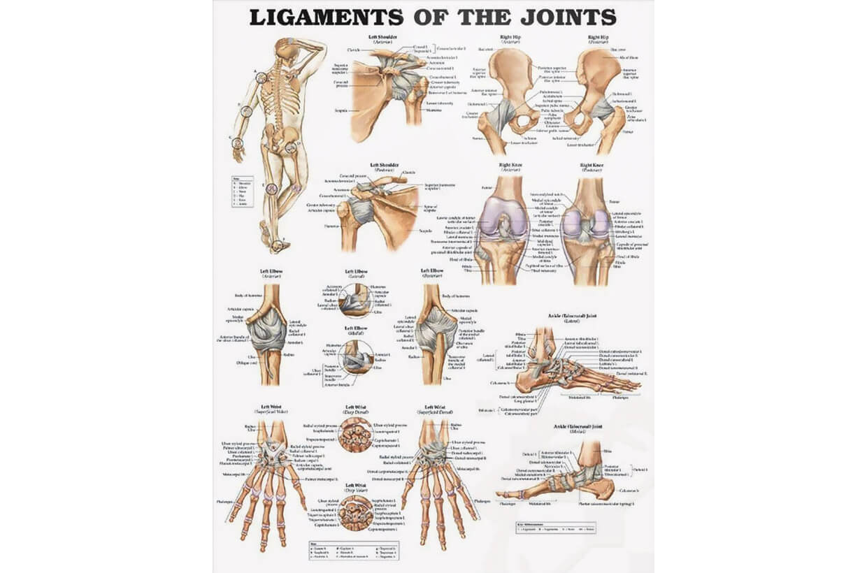 Zobrazení umístění jednotlivých spojů, přední a zadní pozľad na levém rameni, pravé kyčel, pravé koleno a levé koleno. Také boční a mediální pohledy na levé koleno a kotník.