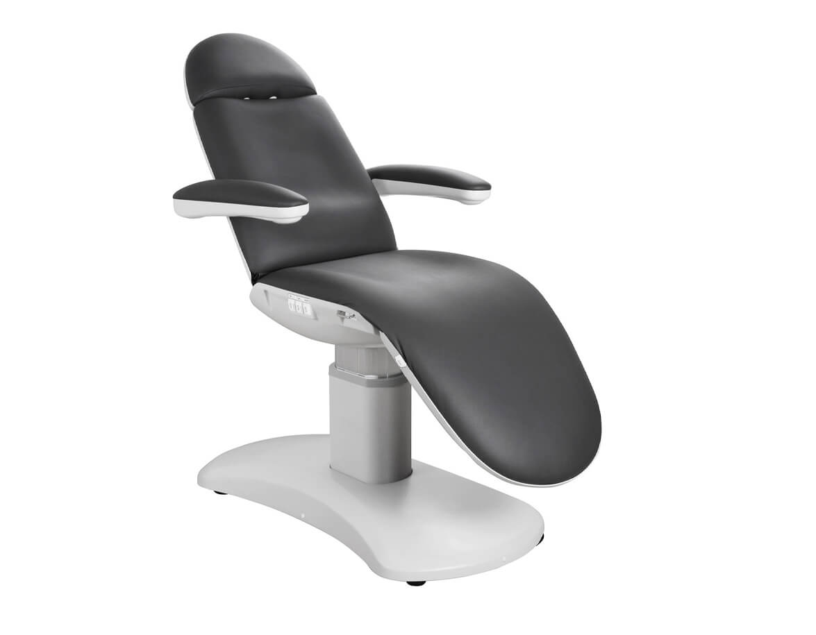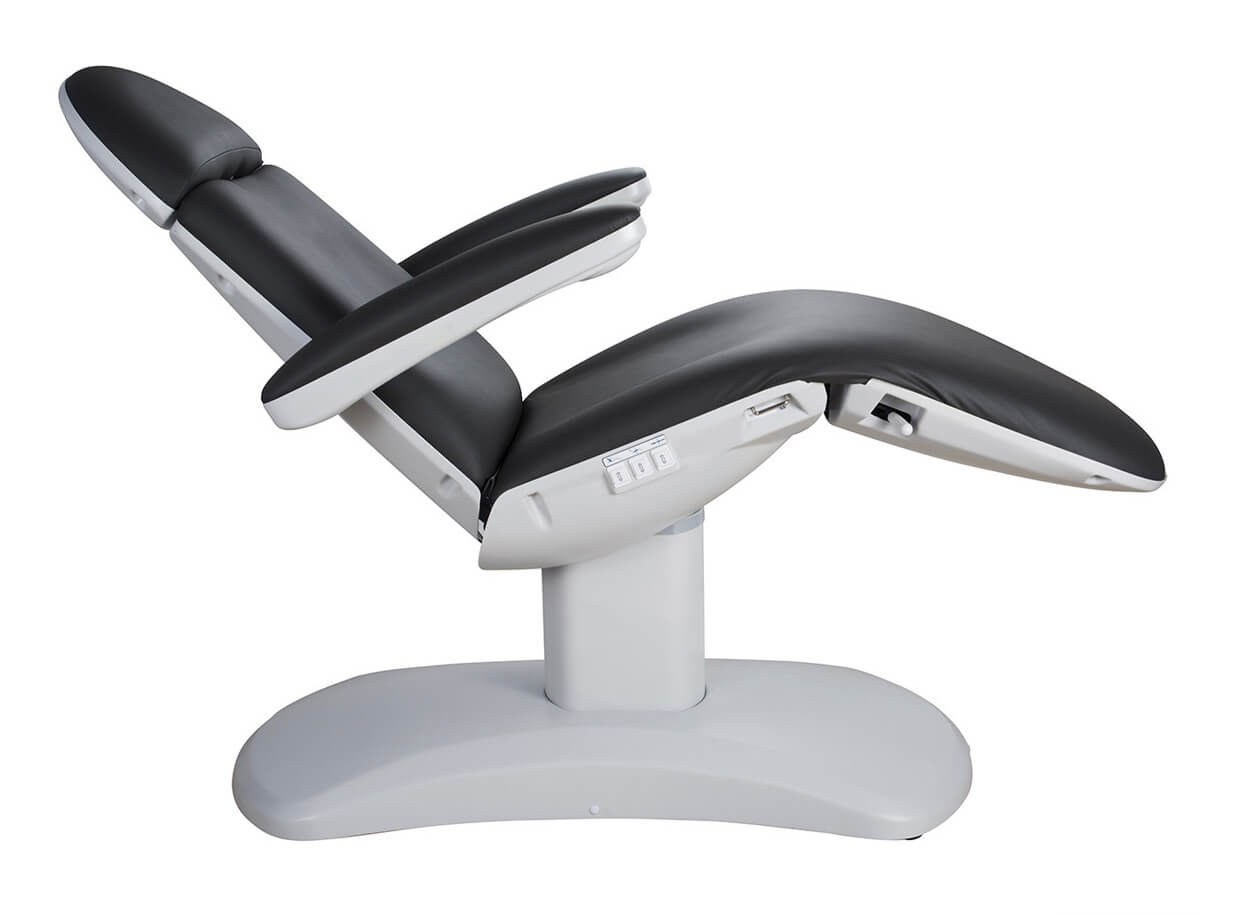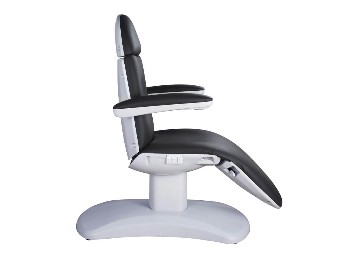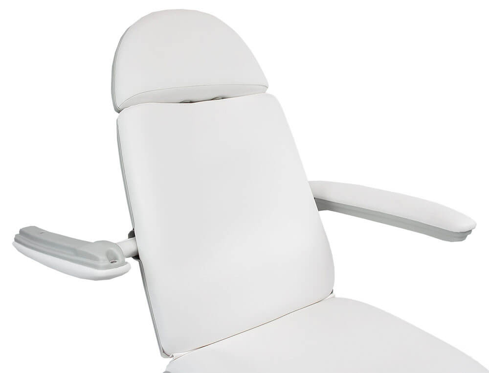 Hlavová opěrka lehátka je vysouvatelná a přizpůsobí se tak i vyšší postavě. Výklopné loketní opěrky umožňují bezproblémový přístup ke klientovi. Křeslo je čalouněné odolnou syntetickou kůží se snadnou údržbou a čištěním. Anatomicky tvarované polstrování zaručuje pohodlný posed.