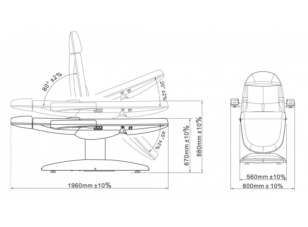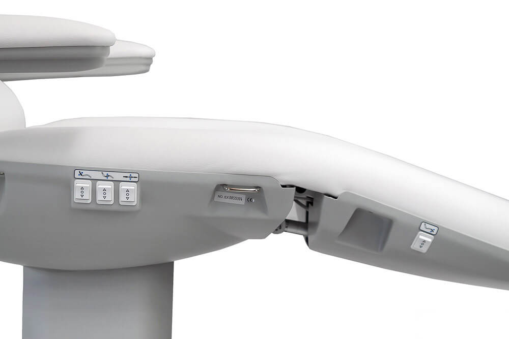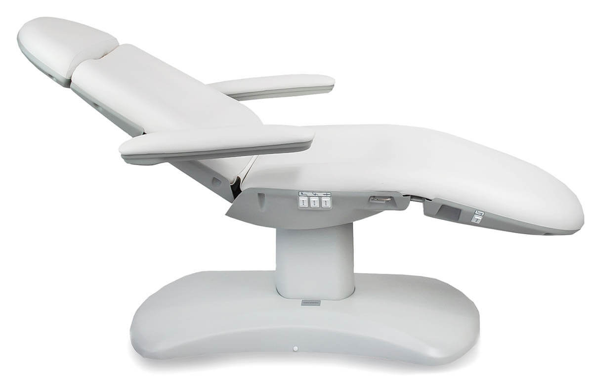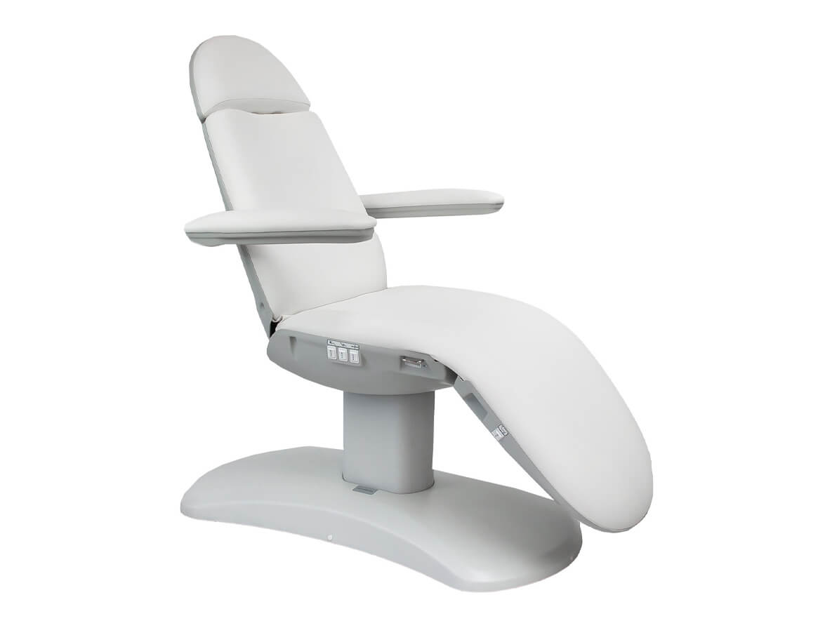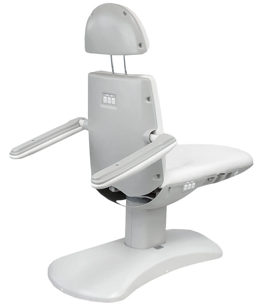 Hlavová opěrka lehátka je vysouvatelná a přizpůsobí se tak i vyšší postavě. Výklopné loketní opěrky umožňují bezproblémový přístup ke klientovi. Křeslo je čalouněné odolnou syntetickou kůží se snadnou údržbou a čištěním. Anatomicky tvarované polstrování zaručuje pohodlný posed.