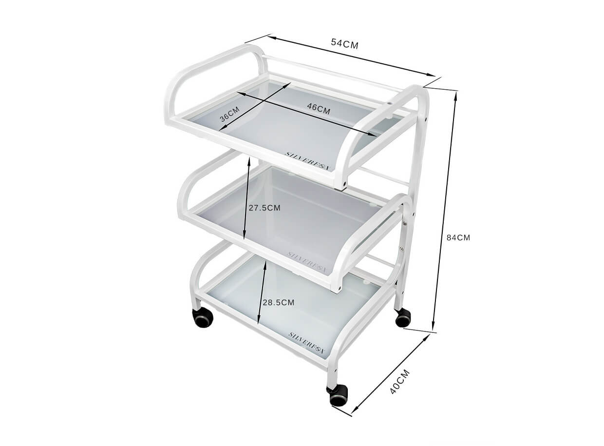 Stolek na kolečkách se 3 policemi s rozměry 46 x 36 cm. Kovový rám stolku má 84 cm na výšku, 54 cm na šířku a 40 cm na délku.