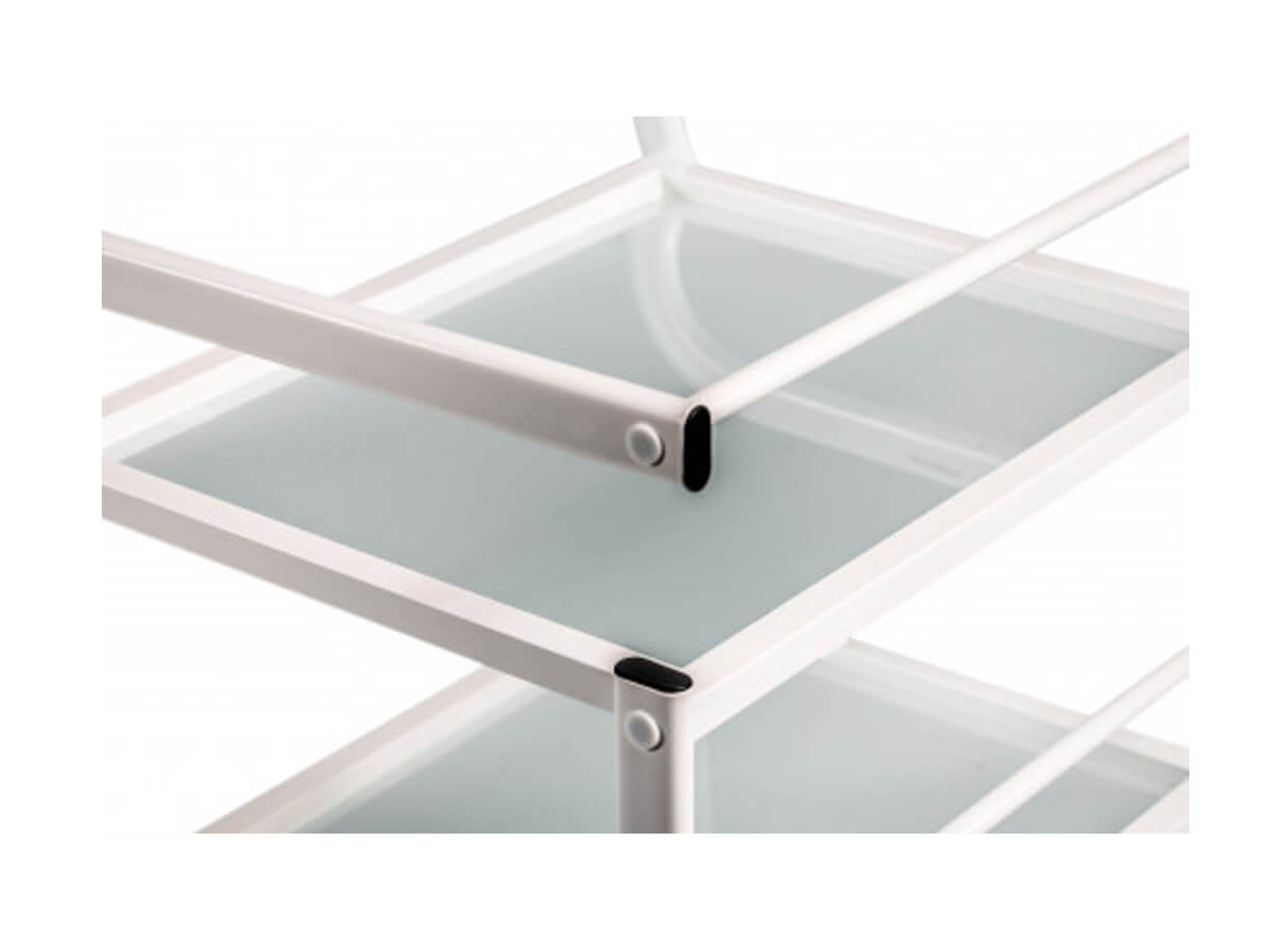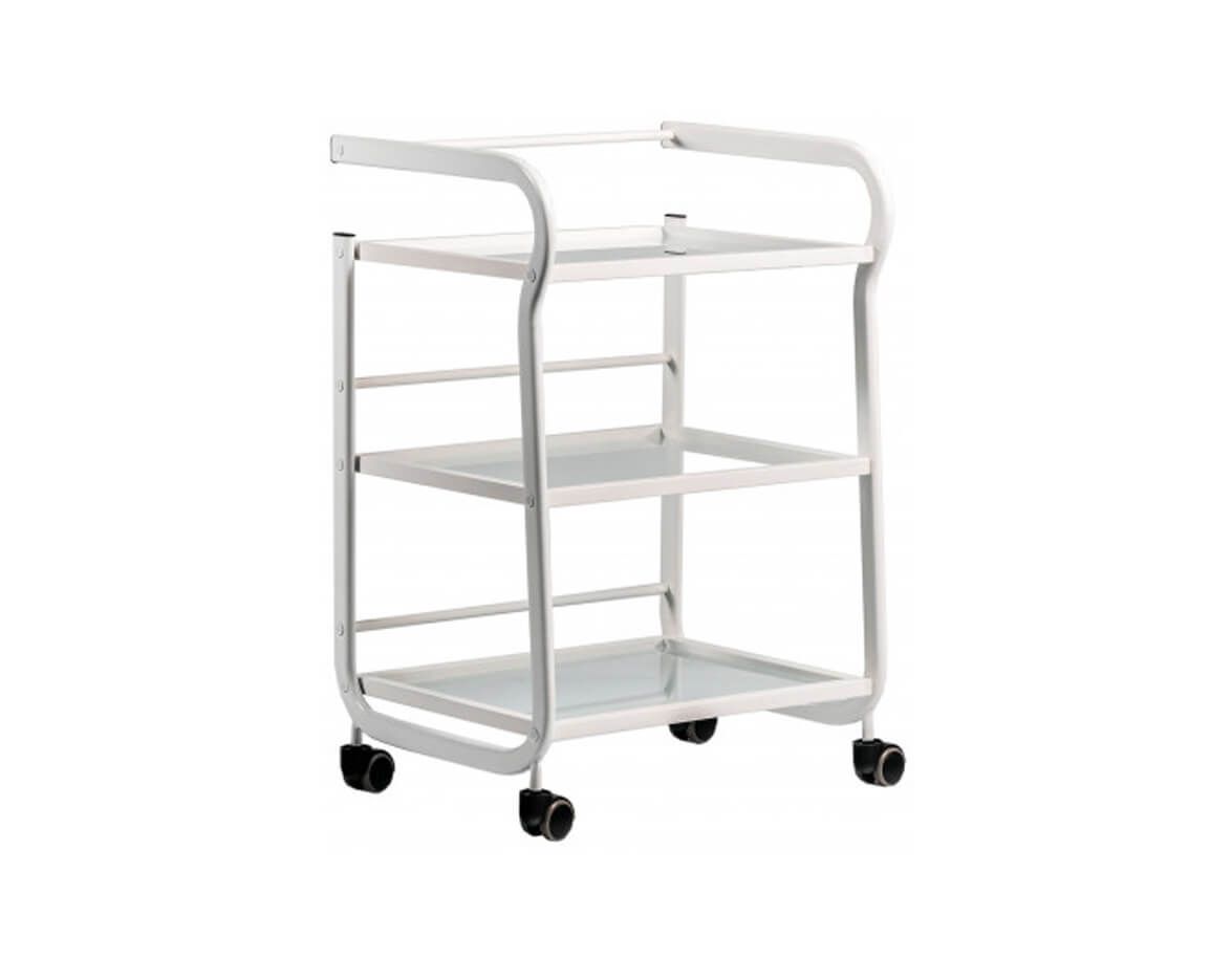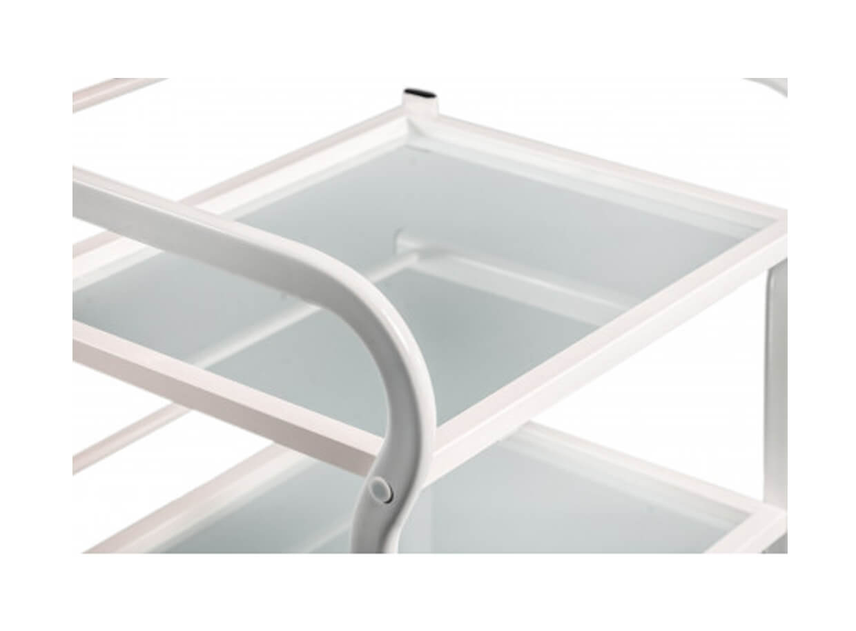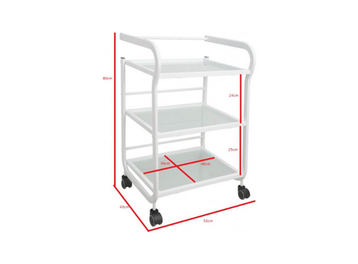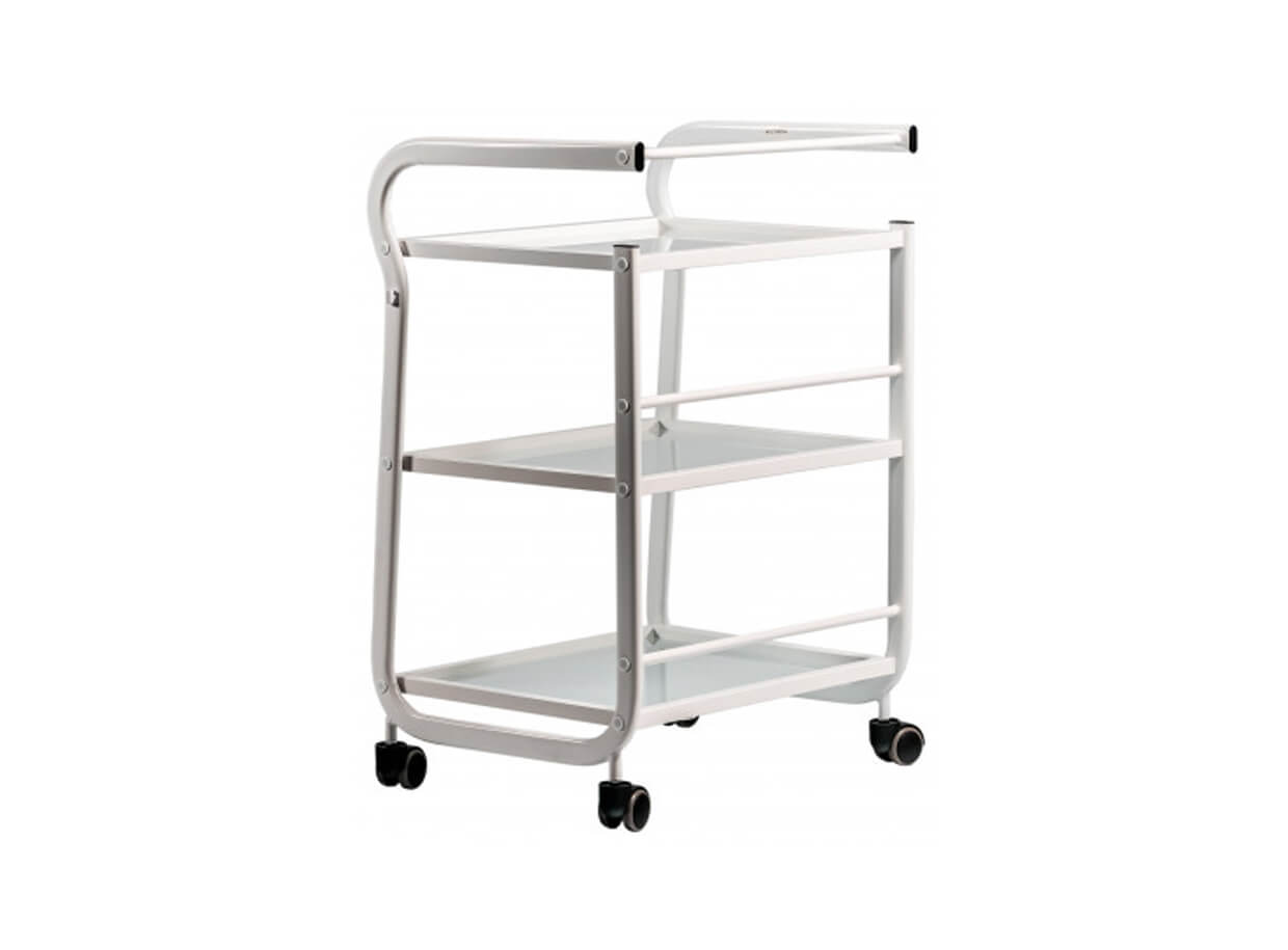 Elegantní stolek Vision s kovovou konstrukcí a otevřenými skleněnými policemi. Vozík je plně mobilní a lehce se přemísťuje. Rozměry poliček poskytují prostor pro odkládání masážních pomůcek, lávových kamenů, masážních baněk na baňkování nebo tejpů.