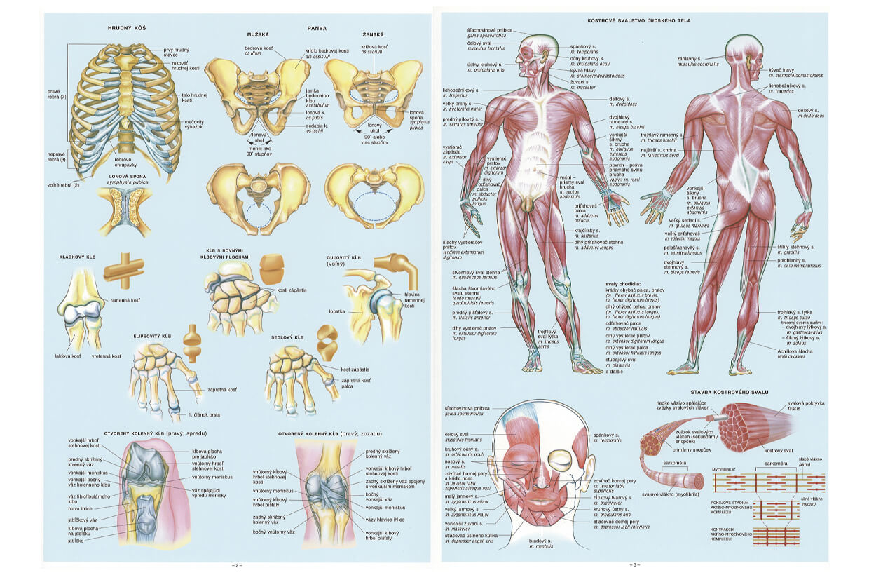 Čtyřstránková brožura formátu A4 podrobně popisuje svalstvo a kostru člověka. Je vyrobena z kvalitního pogumovaného papíru. Obsahuje barevné ilustrace, slovenské a latinské popisky.