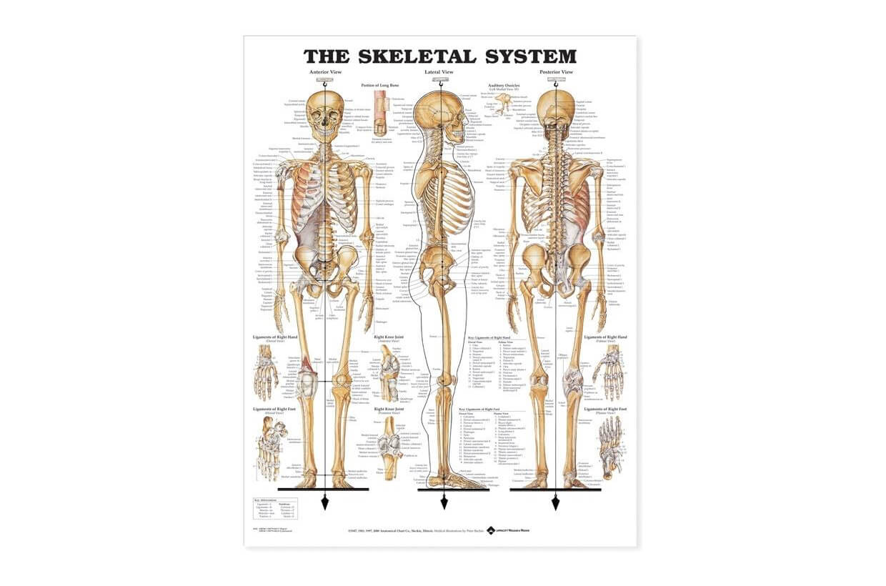 Plakát zobrazuje přední, boční a zadní pohledy na kosterní systém.
