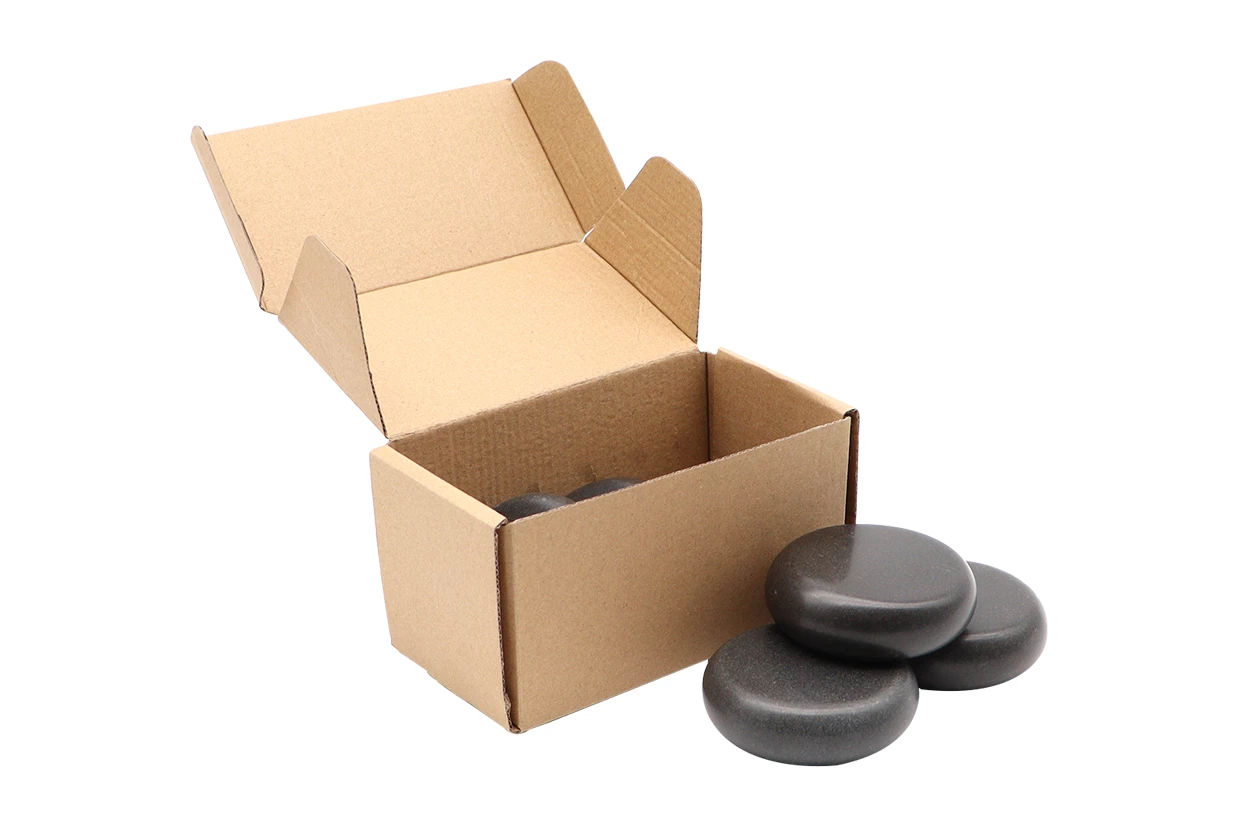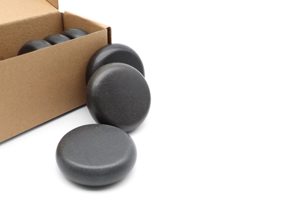 Sada masážních čedičových kamenů stejné velikosti a tvaru, určených k profesionální masáži různých částí těla. Jsou vyrobeny z velkých lávových kamenů bohatých na obsah železa, díky němuž rychle absorbují a dlouhodobě udržují teplo.