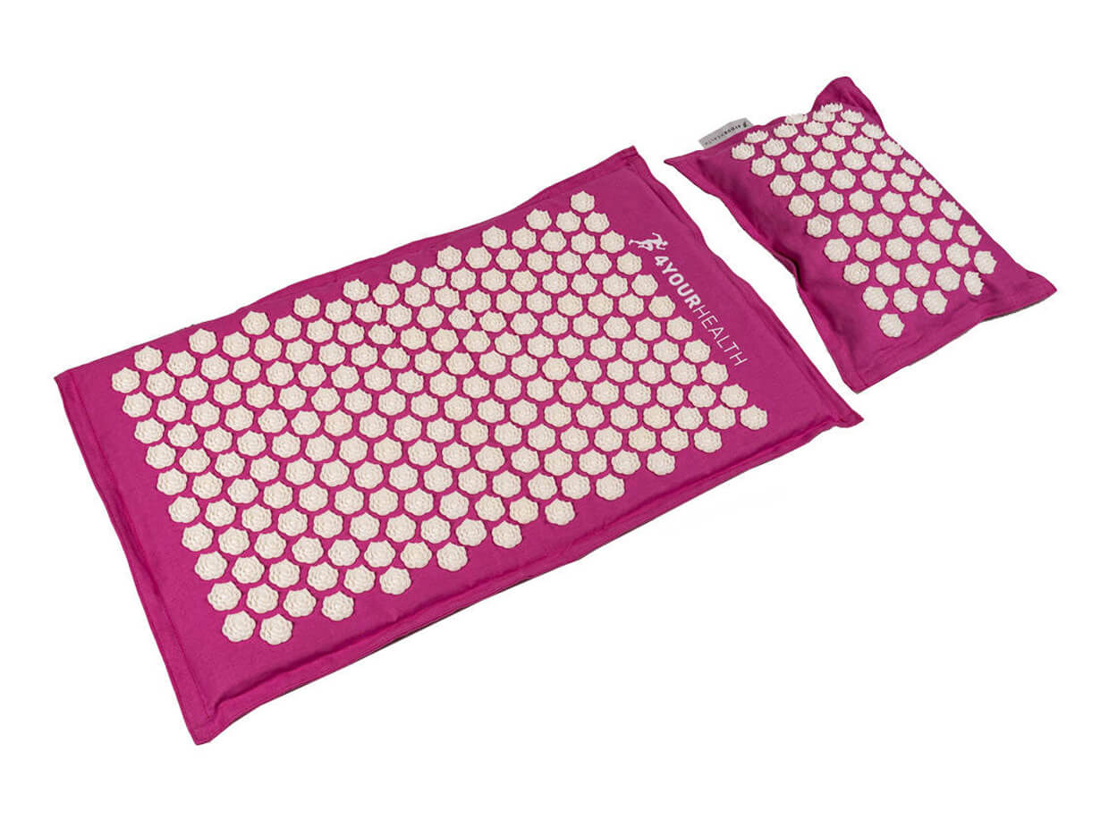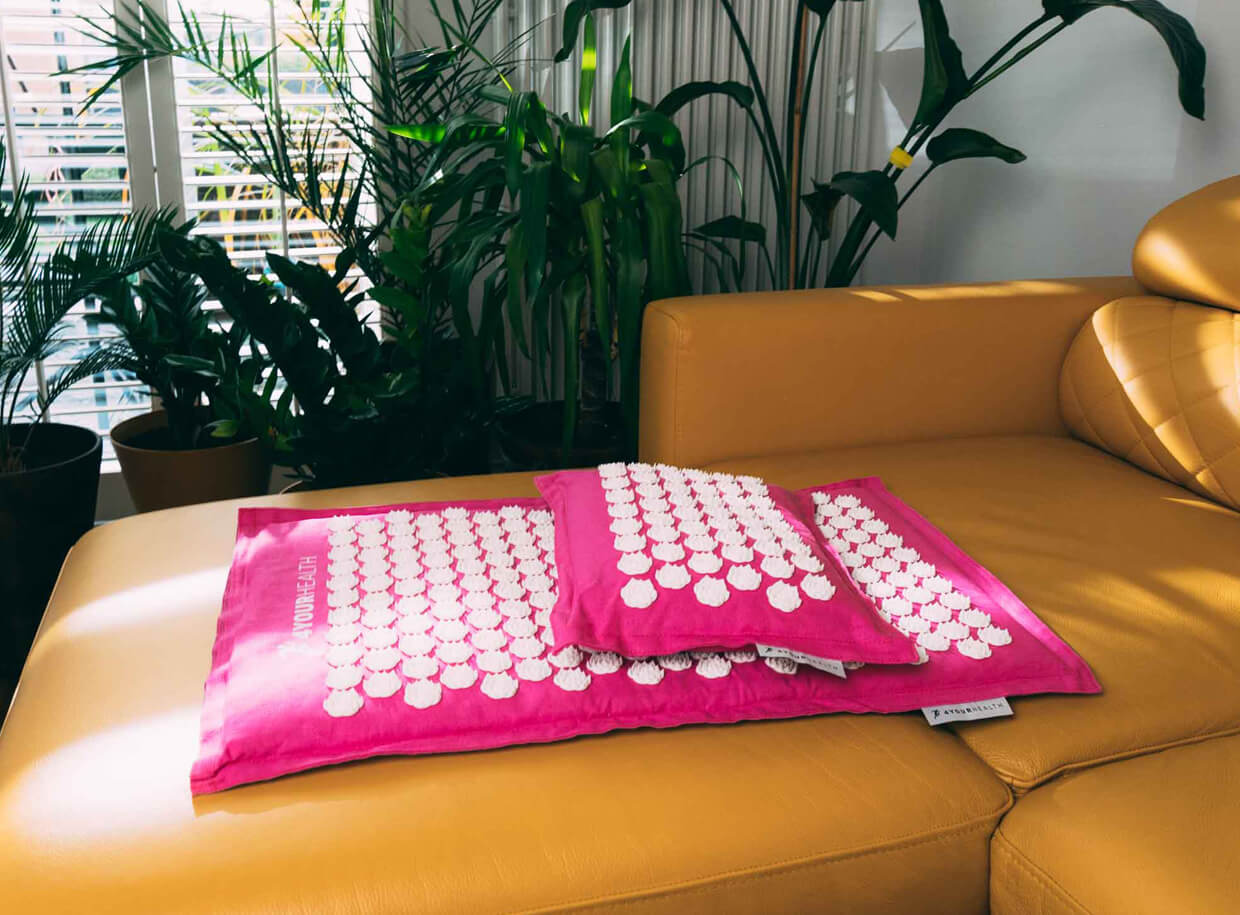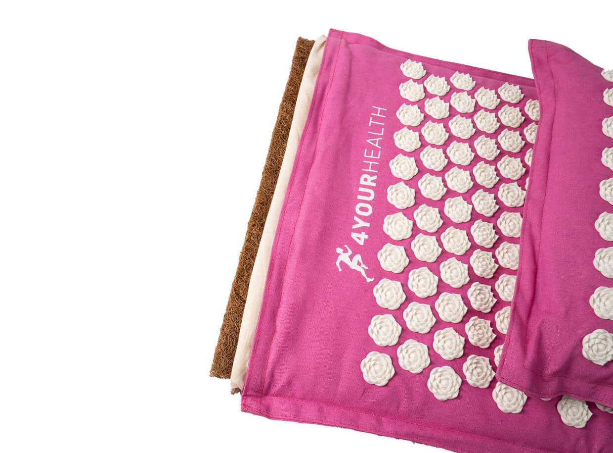 Ekologická akupresurní podložka a polštář s kruhovými rozetami pro masáž akupresurních bodů. Poskytnou kompletní relaxaci pro tělo i mysl a podporují regeneraci celého organismu.
