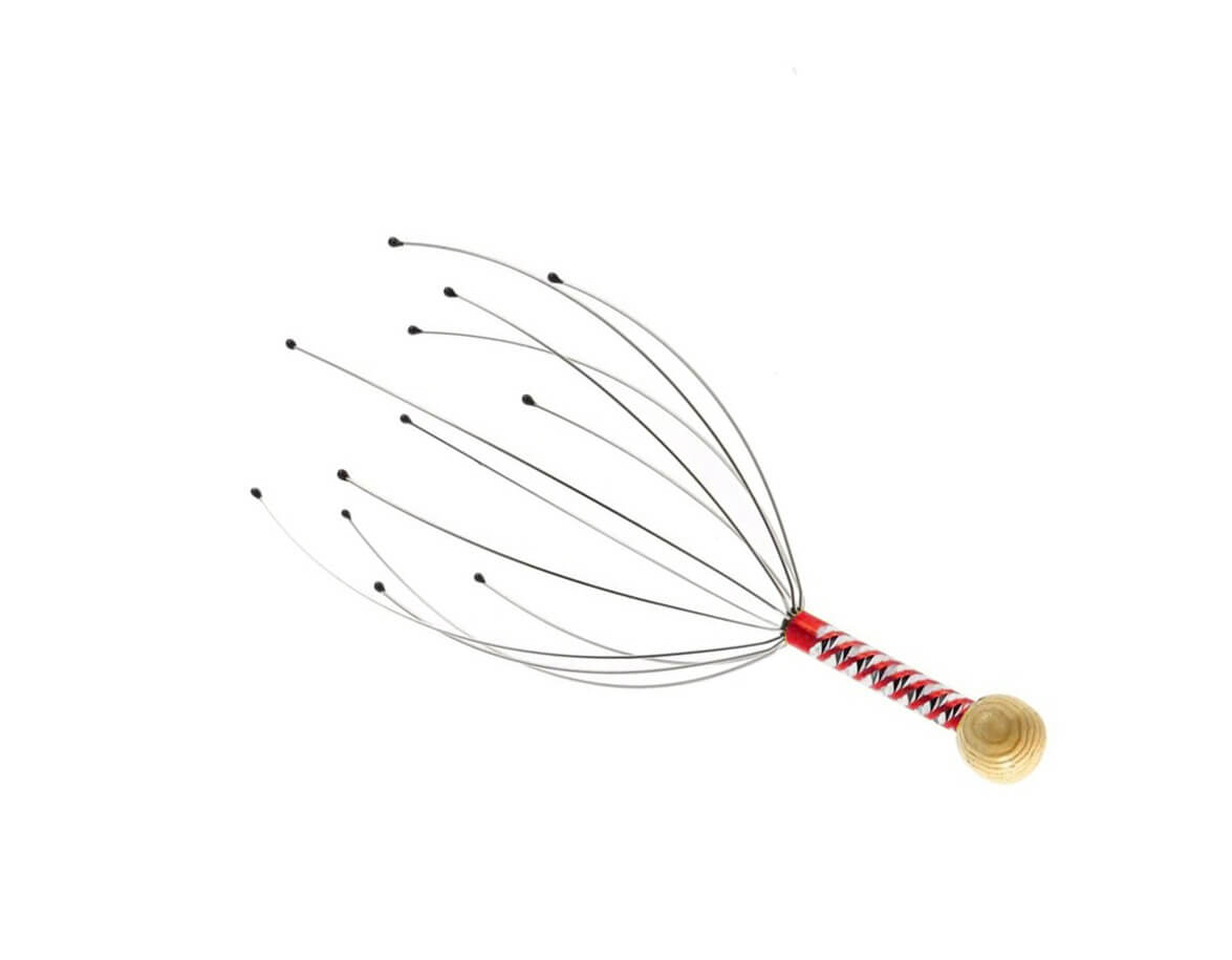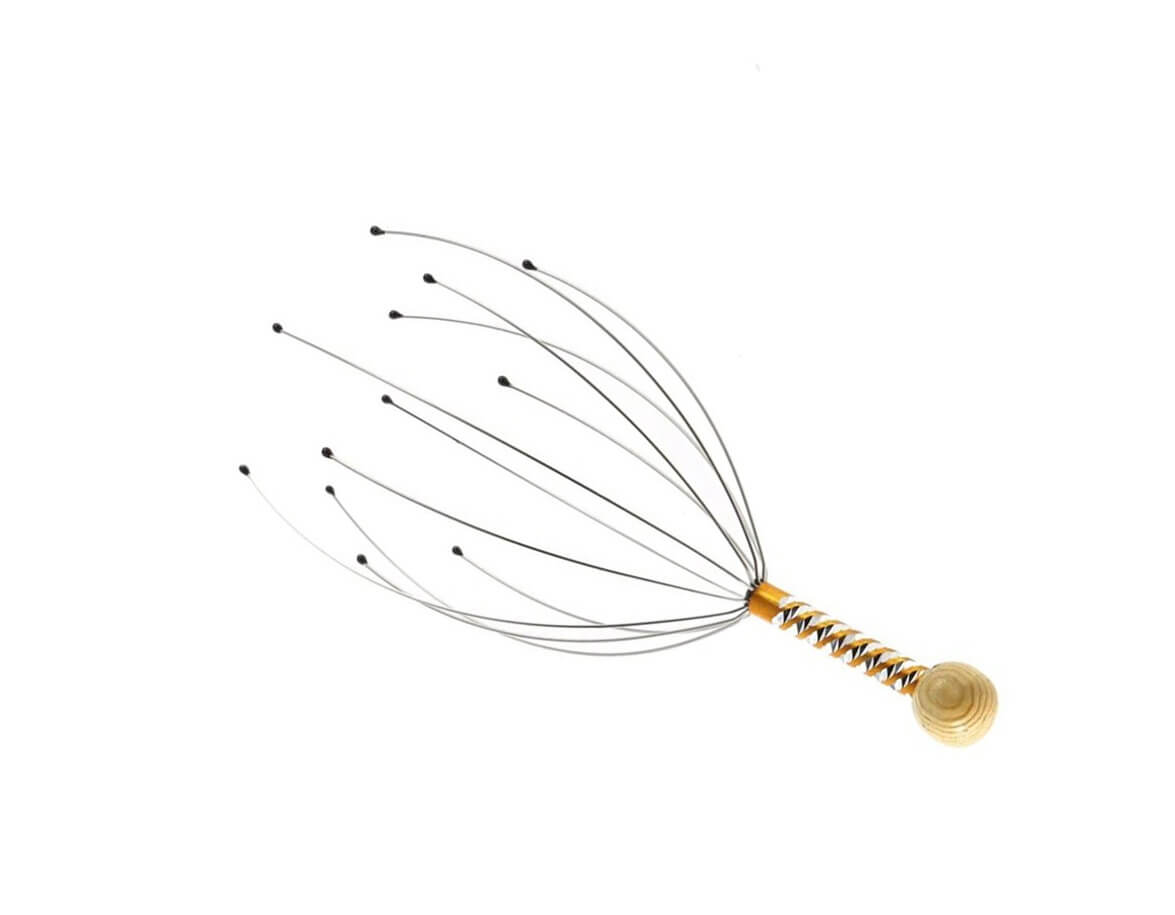 Masážní pomůcka na uvolňující masáž hlavy. Tenké lehoučké kovové výběžky ukončené jemnými kuličkami masírují pokožku hlavy a stimulují nervová zakončení. Pro rychlý relax celého těla, zmírnění napětí, stresu a bolestí hlavy. Prokrvení pokožky hlavy také podporuje růst vlasů. Pomůcka se dá použít i na uklidňující masáž ramene, lokte nebo kolena.