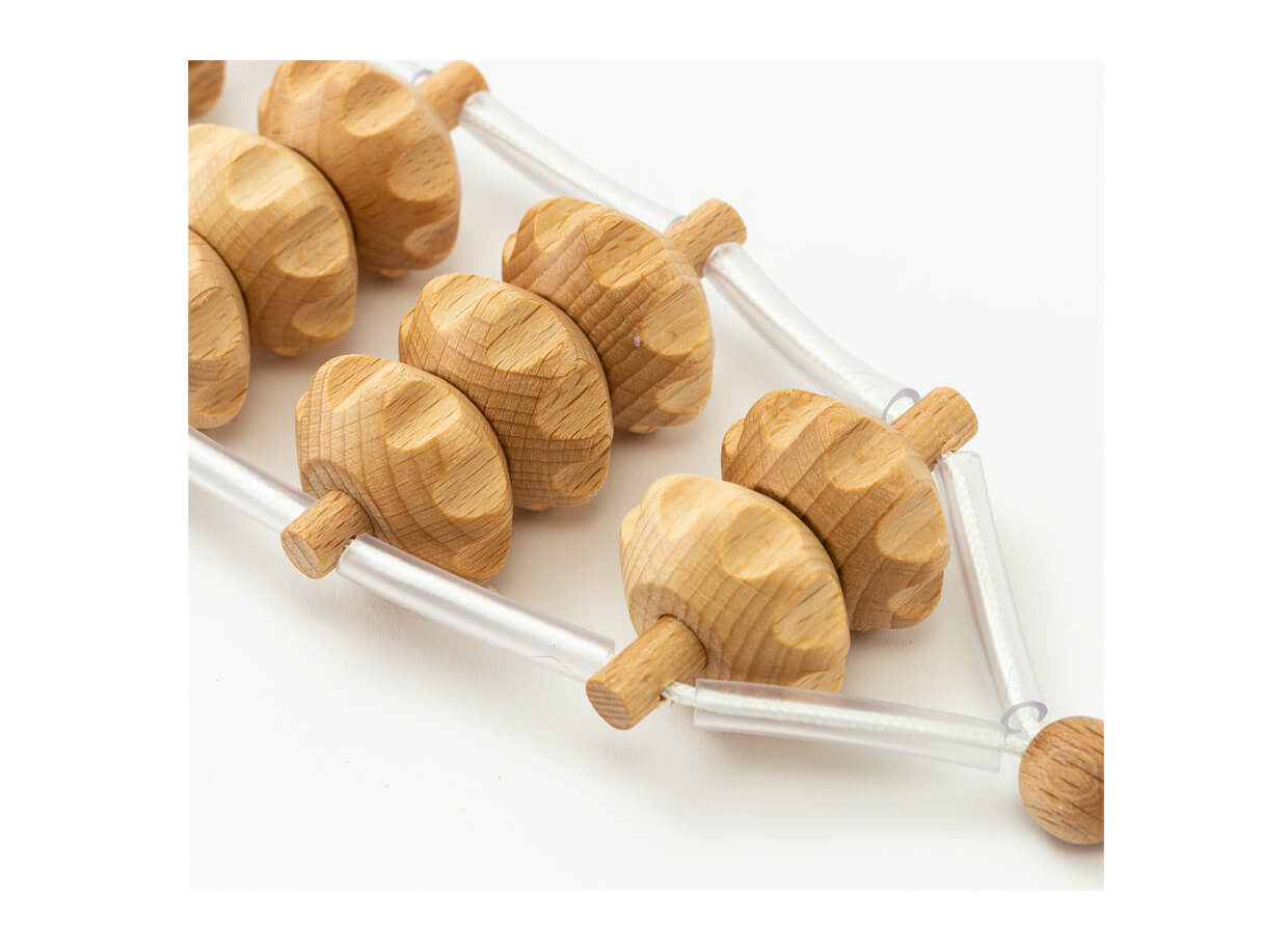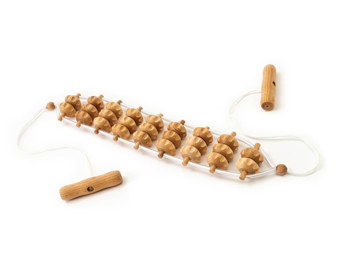 Masážní pás z bukového dřeva je sestaven z 25 tvarovaných masážních válečků. Je výborný pro automasáž zad, pasu, boků, zadečku a stehen. Používá se také v profesionálních masážních salonech.