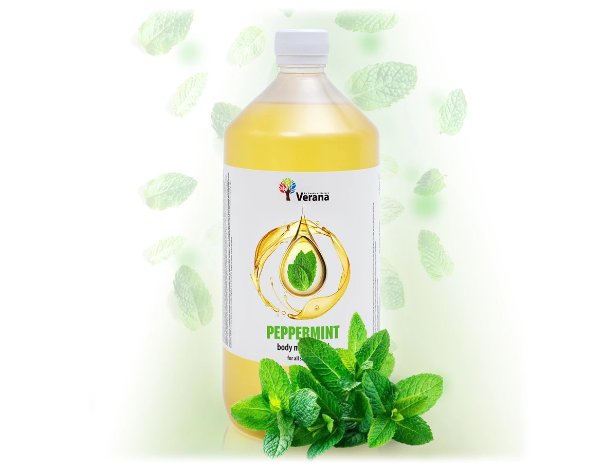 Tělový masážní olej Máta peprná na regenerační masáž a procedury proti stárnutí. Má příjemnou, osvěžující vůni, snadno se roztírá a vstřebá do pokožky.