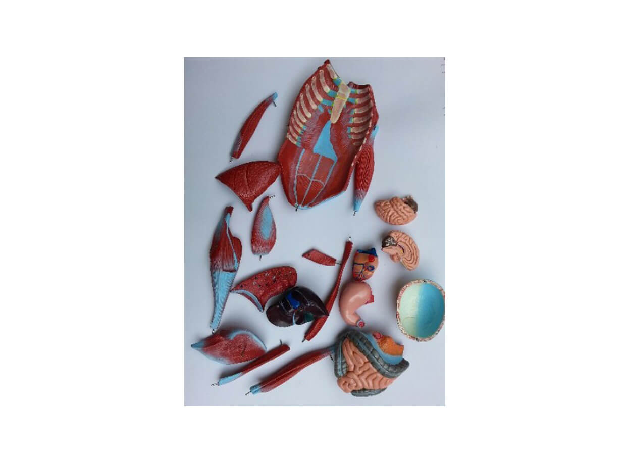 Základní konstrukci lidského těla, průřez lebky, mozek složený ze 2 částí, hrudní a břišní stěna, pravé rameno, levé rameno složené z 5 částí, noha složená z 9 částí, plíce složené ze 2 částí, srdce složené z 2 částí, játra, žaludek a střeva.