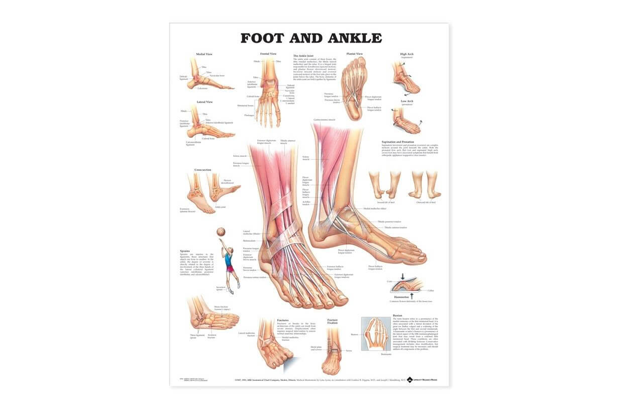 Menší obrázky ilustrují pohledy na nohu a kotník z různých směrů, jakož i nejčastější zranění a problémy nohy a kotníku.