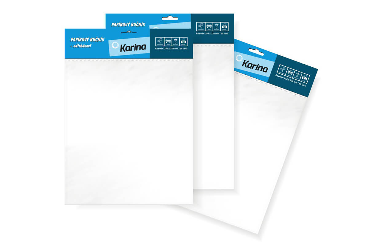 Odtrhávací papírové ručníky KARINA s eurovýsekem na zavěšení mají univerzální použití. Jsou vhodné k utírání umytých rukou, pro čištění skla, k setření nečistot, olejů, atd.
