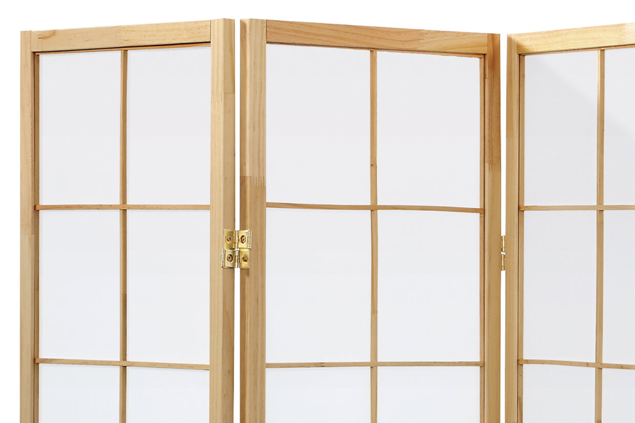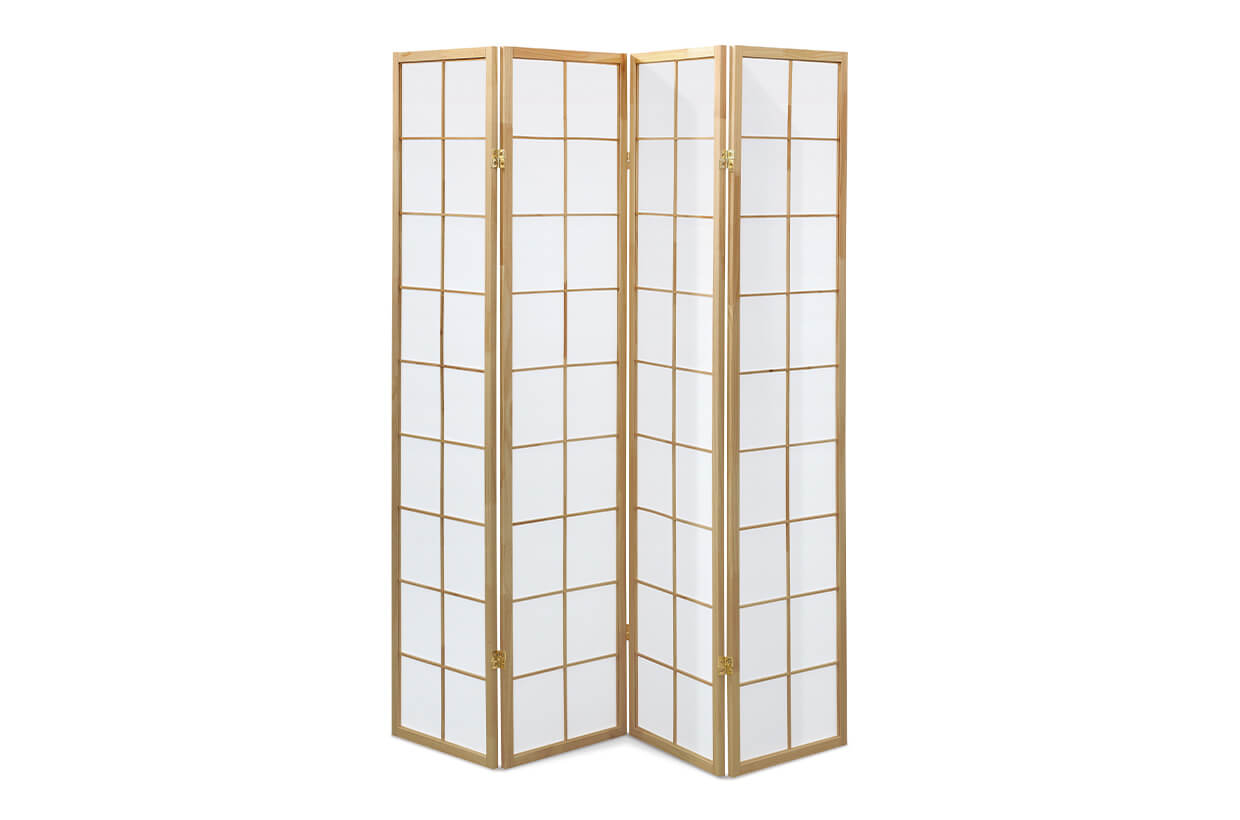 Moderní čtyřdílný paraván s dřevěnou konstrukcí z masivního smrku v přírodní barvě.