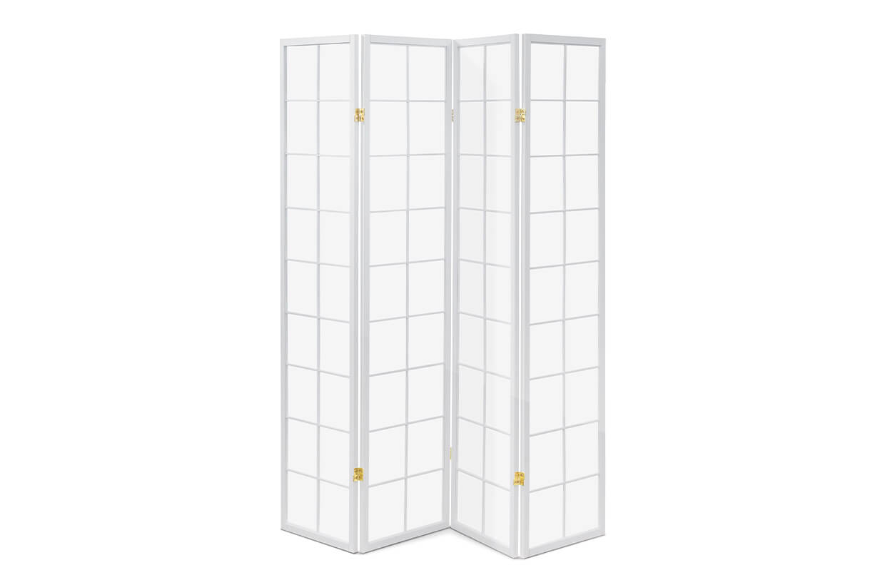 Moderní čtyřdílný paraván s dřevěnou konstrukcí z masivního smrku v bílé barvě.