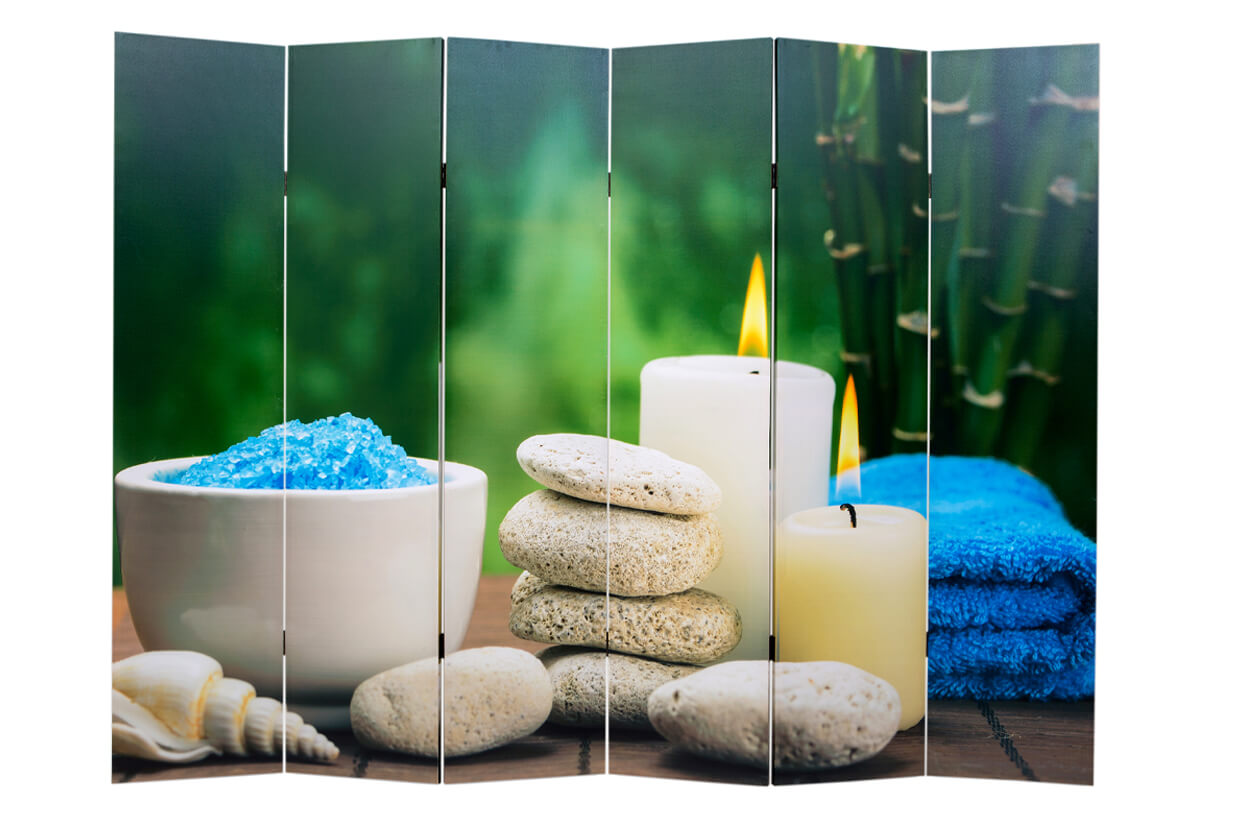 6-dílný paraván Masáž v modré s fotopotiskem z obou stran.