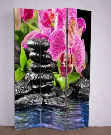 3-dílný paraván Kámen-voda-květ s fotopotiskem z obou stran.