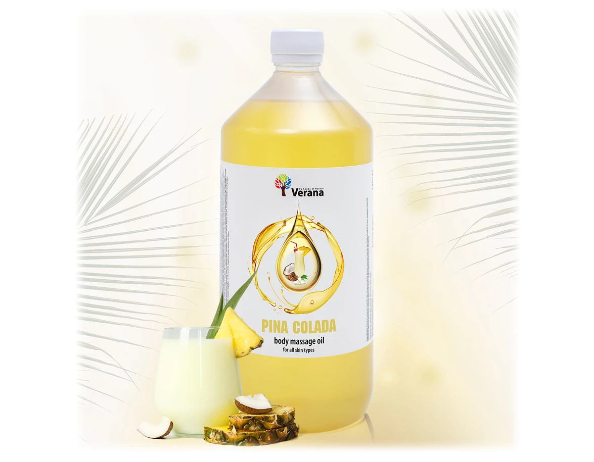 Masážní olej s vůní exotického koktejlu Piňa Colada pro regenerační a omlazující masáž celého těla.