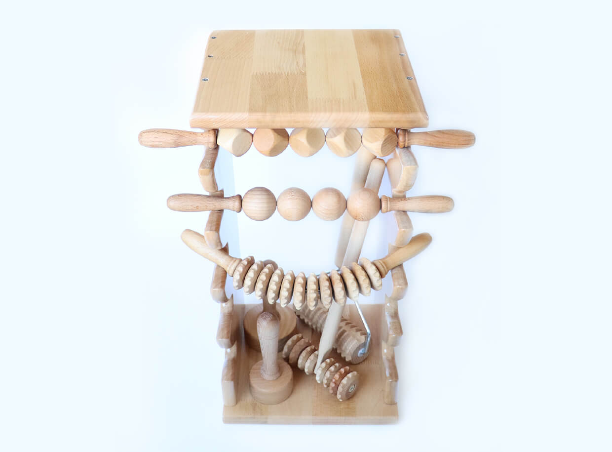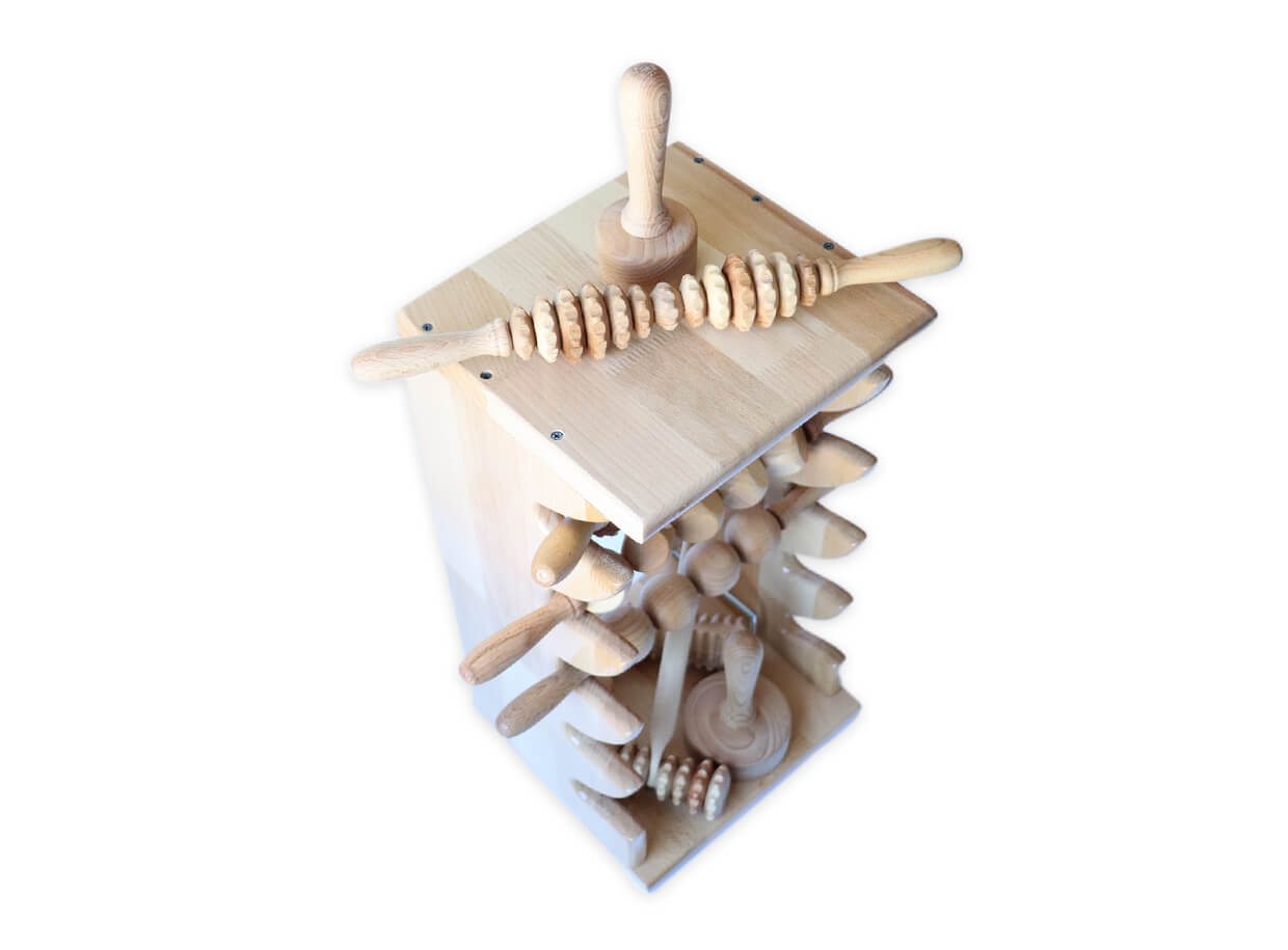 Police na maderoterapii šetří prostor, válečky budete mít vždy po ruce. Ve válečcích a pomůckách uložených v polici máte dokonalý přehled, takže vždy sáhnete po tom správném nástroji.