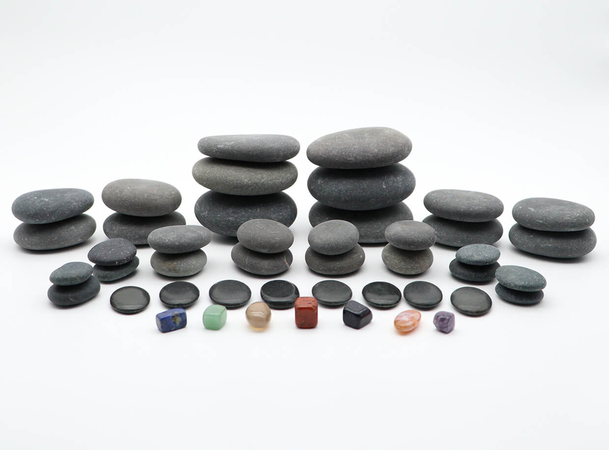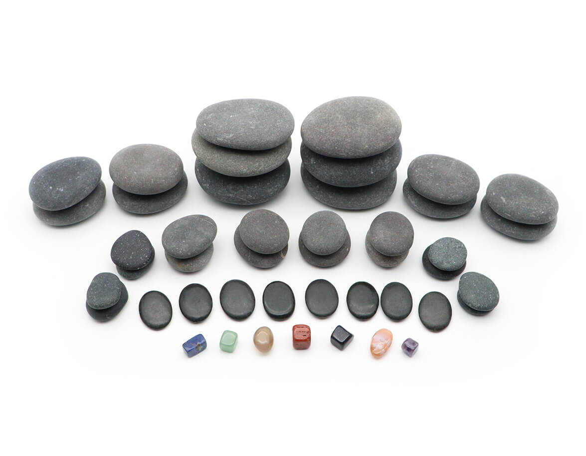 Komplexní 45 kusová sada přírodně tvarovaných čedičových kamenů. Sada obsahuje sety kamenů přibližně stejných rozměrů v rámci jednotlivých velikostí a sedm čakrových kamenů z polodrahokamů.