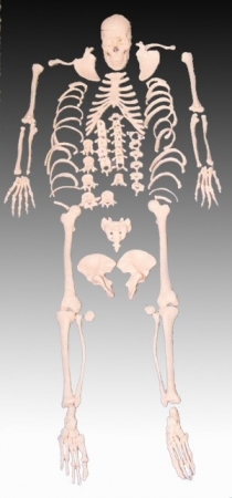 Rozebraná kostra člověka v životní velikosti, s lebkou ze 3 částí a pravou rukou a nohou v celku (spojenou drátem).