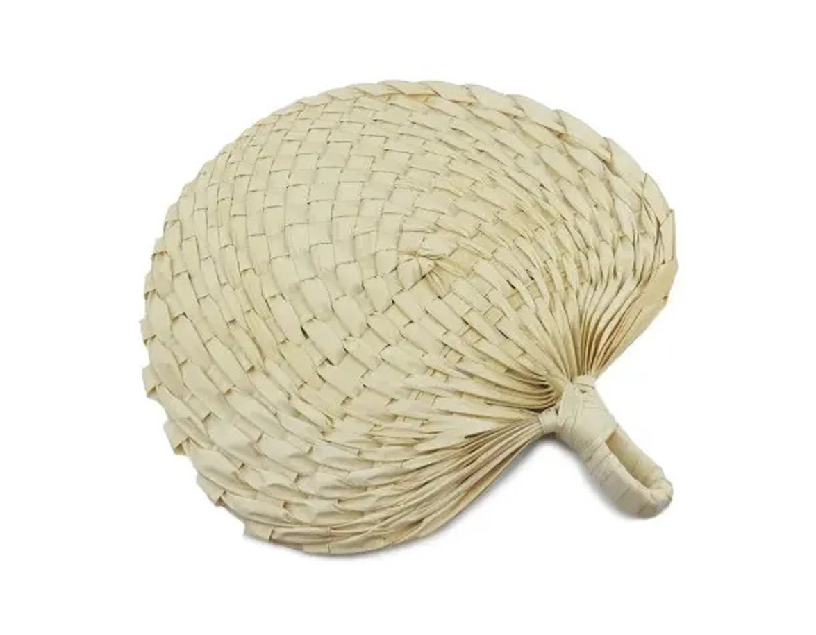 Vějíř je zhotoven z čistě přírodního materiálu. Palmové listy jsou navzájem propleteny do pevného půlkruhového tvaru o průměru 35 cm s rukojetí pro uchopení.