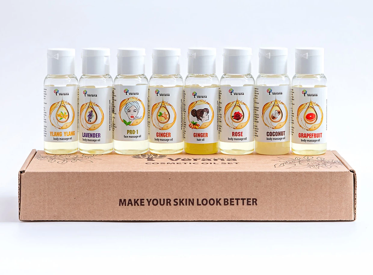 Set 8 masážních olejů v ekologické papírové krabičce, který potěší jako dárek nebo testovací sada. Oleje jsou vhodné pro různé druhy masáží, každý má unikátní vůni a prospěšné účinky pro pokožku pleť či vlasy.
