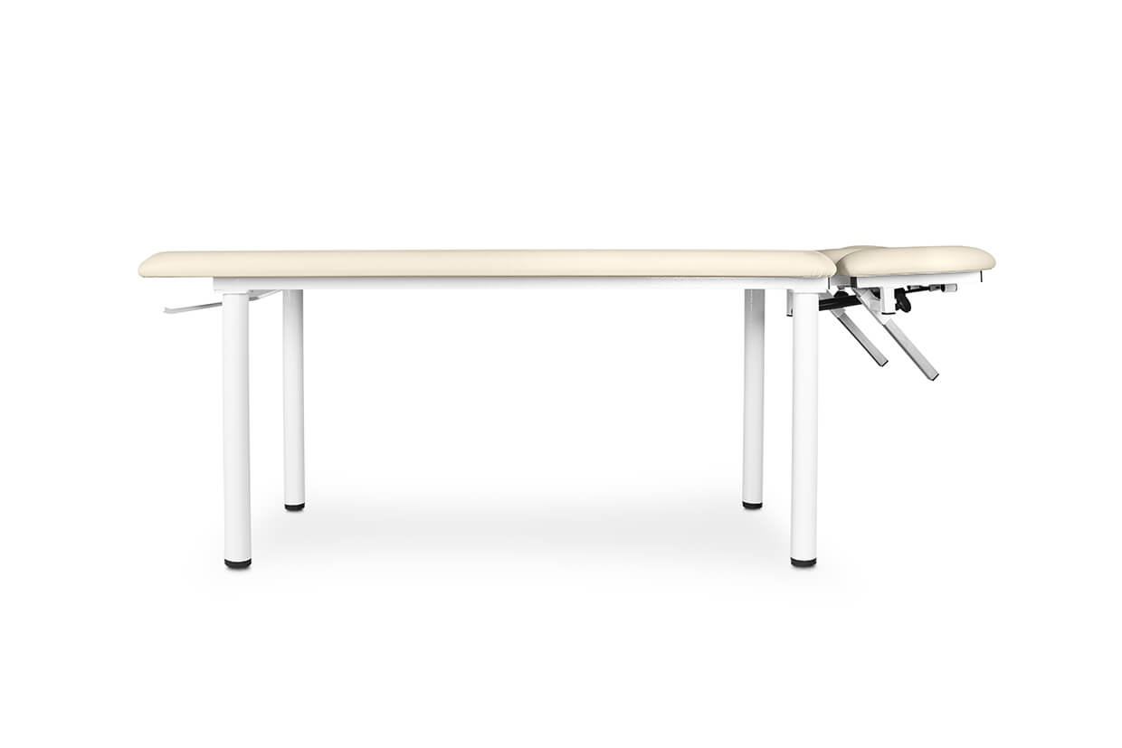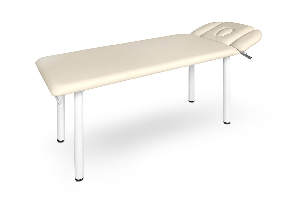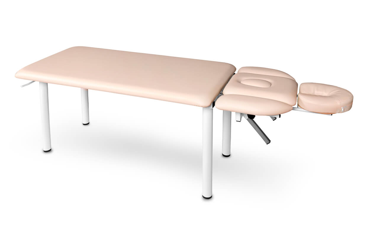 Stabilní a pohodlné dvoudílné fyzioterapeutické a masérské lehátko s pevnou výškou. Vrchní část lehátka je rozdělená na 3 části - středová část podpírá hlavu a boční loketní opěrky se dají posouvat a jednoduše aretovat v libovolné poloze až 14 cm pod úroveň hlavové části. Zároveň lze vrchní část jednoduše napolohovat pomocí plynové vzpěry až do úhlu 45° nad úroveň lehátka nebo 35° pod úroveň lehátka. Lehátko je pohodlně čalouněné 4 cm hrubým molitanem a kvalitní, snadno čistitelnou koženkou a vybavené výškově nastavitelnými protiskluzovými nožičkami a držákem na 50 cm plachty.