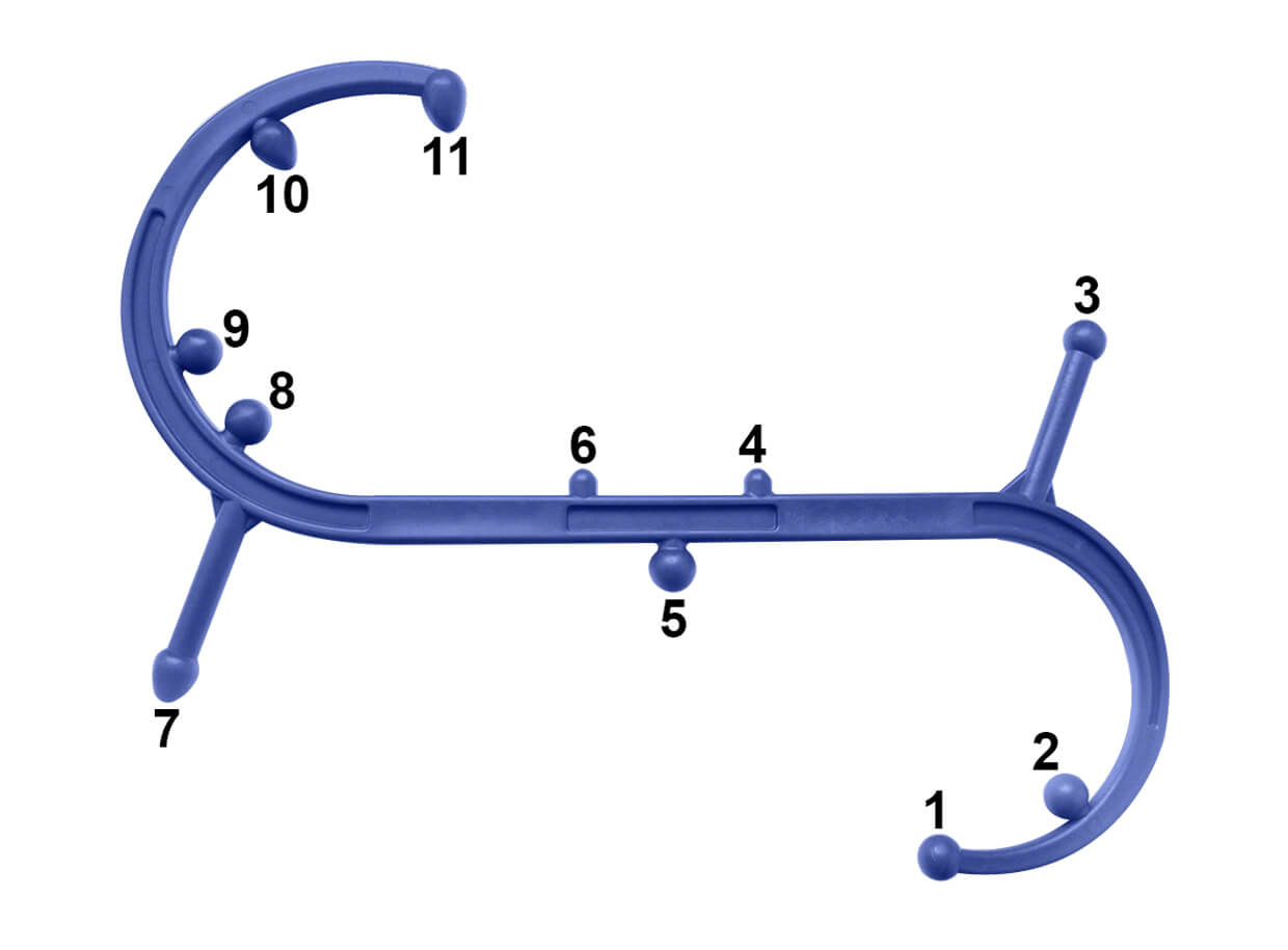 Masážní body 1 a 11 jsou vhodné pro jemnou masáž zad a paží. K reflexní masáži chodidel můžete použít body 2 a 10. Body 4 a 6, které se nacházejí v centrální části masažéra, slouží k masáži křížů a zad. Pro masáž šíje a spodní části lebky jsou vhodné body 8 a 9. Ostatní masážní body 3, 5 a 7 můžete použít dle potřeby, na kteroukoli část těla.